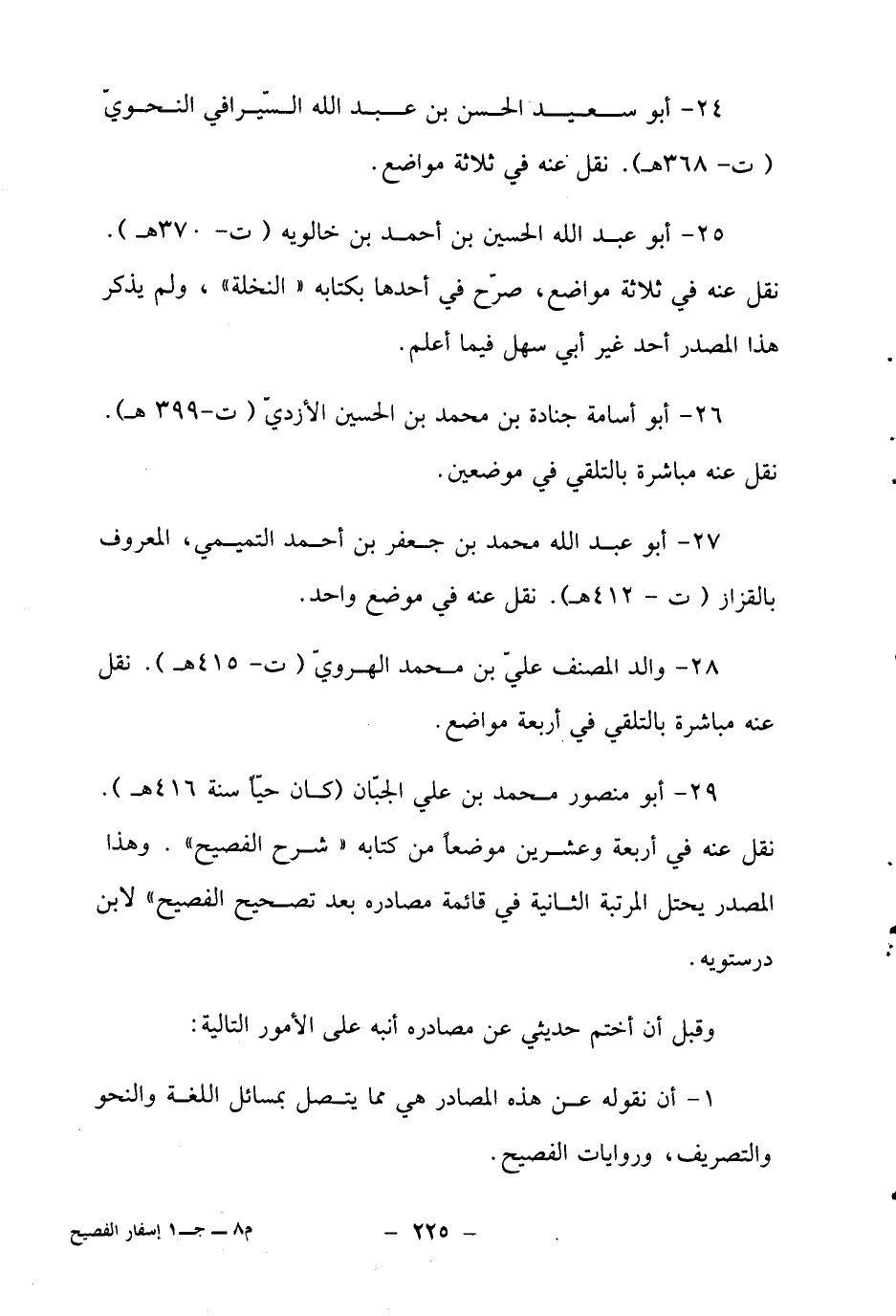 1- أن نقوله عن هذه المصادر هي مما يتصل بمسائل اللغة والنحو والتصريف، وروايات الفصيح.