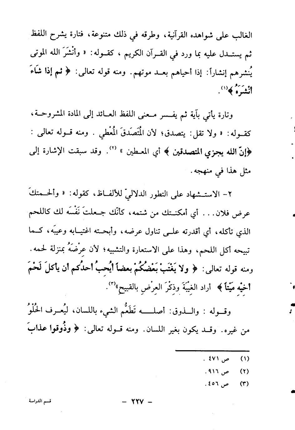 1- الاستشهاد على التطور الدلالي للألفاظ، كقوله: "وألحمتك عرض فلان.... أي أمكنتك من شتمه، كأنك جعلت نفسه لك كاللحم الذي تأكله، أي أقدرتك على تناول عرضه، وأبحته اغتيابه وعيبه، كما تبيحه أكل اللحم، وهذا على الاستعارة والتشبيه، لأن عرضه بمنزلة لحمه. ومنه وقوله تعالى: {وَلا يَغْتَبْ بَعْضُكُمْ بَعْضاً أَيُحِبُّ أَحَدُكُمْ أَنْ يَأْكُلَ لَحْمَ أَخِيهِ مَيْتاً} أراد الغيبة وذكر العرض بالقبيح".