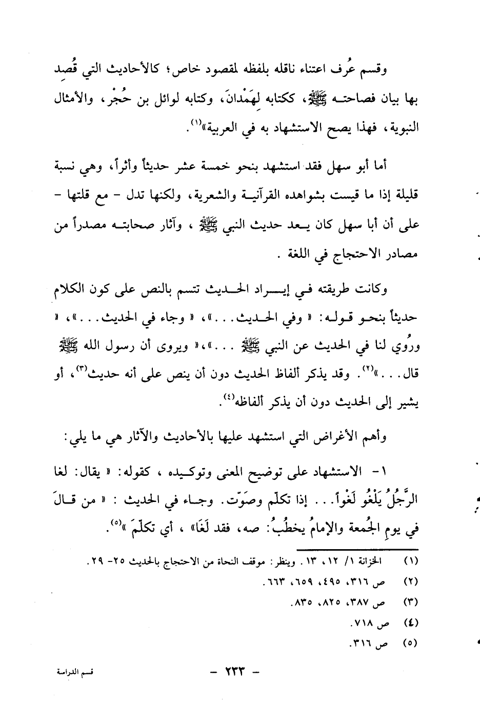 أما أبو سهل فقد استشهد بنحو خمسة عشر حديثا وأثرا، وهي نسبة قليلة إذا ما قيست بشواهده القرآنية والشعرية، ولكنها تدل – مع قلتها – على أن أبا سهل كان يعد حديث النبي صلى الله عليه وسلم، وآثار صحابته مصدرا من مصادر الاحتجاج في اللغة.