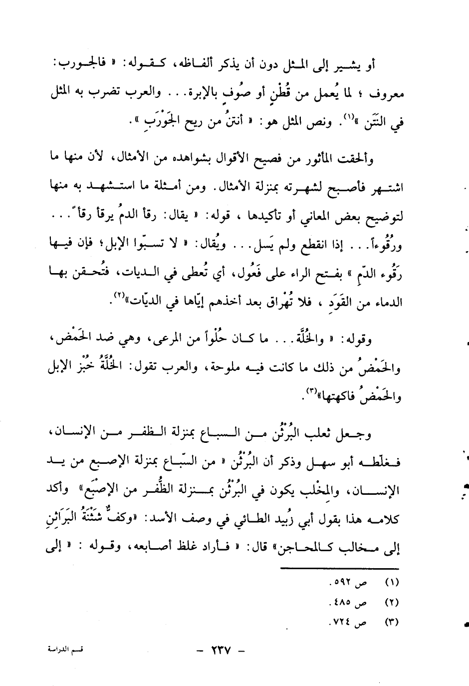 وألحقت المأثور من فصيح الأقوال بشواهده من الأمثال، لأن منها ما اشتهر فأصبح لشهرته بمنزلة الأمثال. ومن أمثلة ما استشهد به منها لتوضيح بعض المعاني أو تأكيدها، قوله: "يقال: رقأ الدم يرقأ رقأ ... ورقوءا ... إذا انقطع ولم يسل ... ويقال: "لا تسبوا الإبل، فإن فيها رقوء الدم"بفتح الراء على فعول، أي تعطى في الديات، فتحقن بها الدماء من القود، فلا تهراق بعد أخذهم إياها في الديات"2.