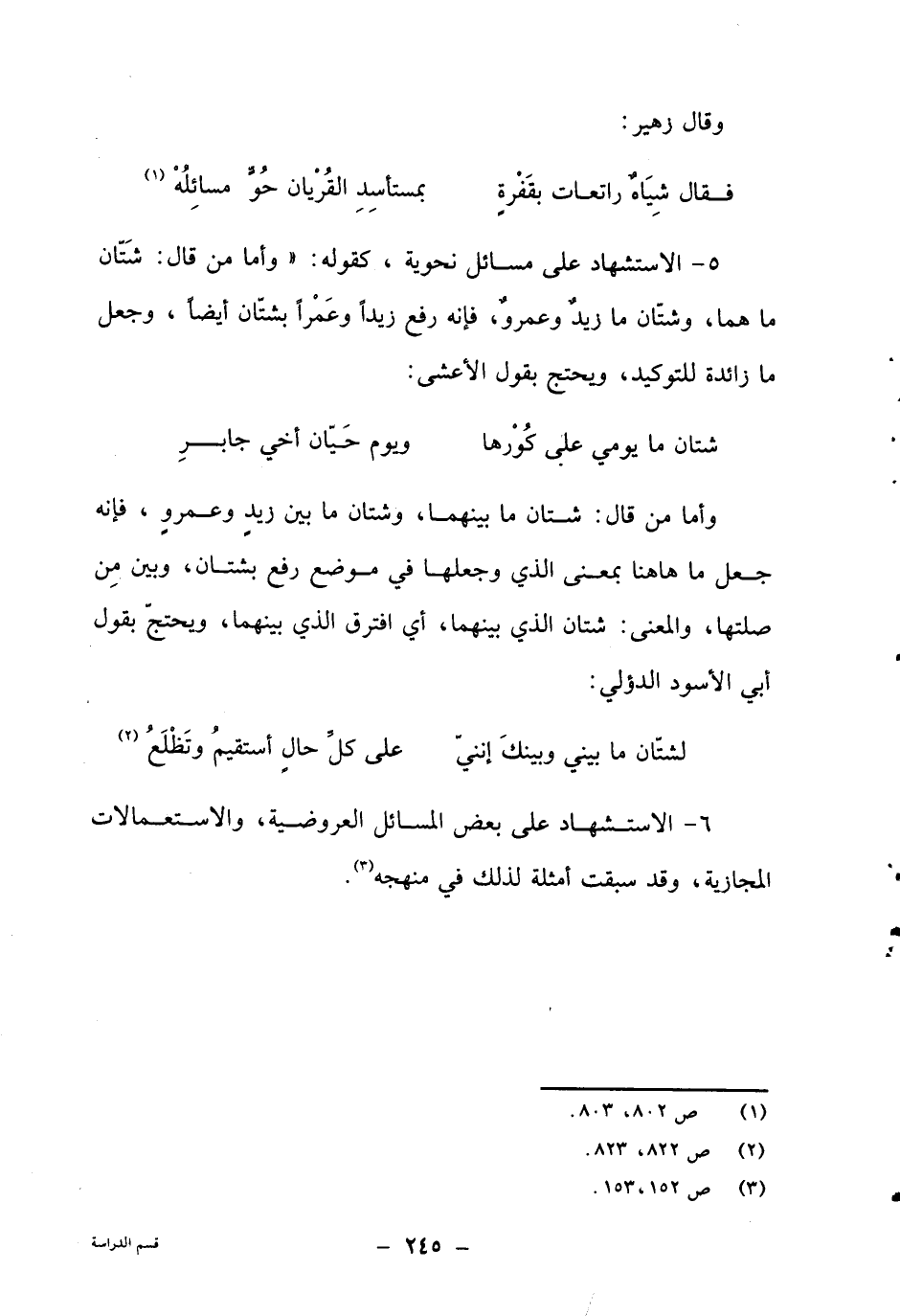 5- الاستشهاد على مسائل نحوية، كقوله: "وأما من قال: شتان ما هما، وشتان ما زيد وعمرو، فإنه رفع زيدا وعمرا بشتان أيضا، وجعل ما زائدة للتوكيد، ويحتج بقول الأعشى: