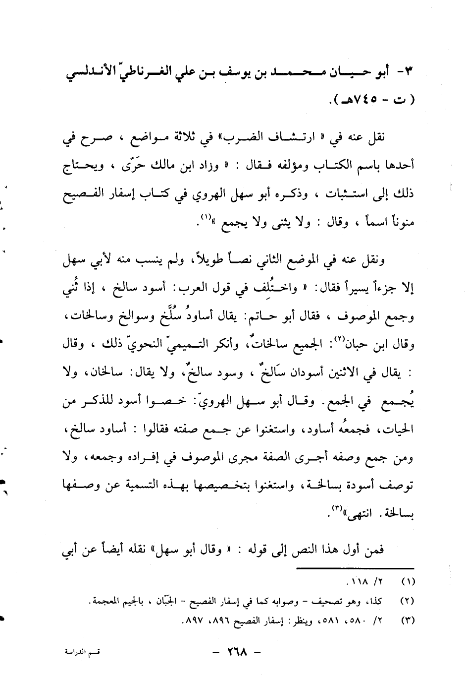 ونقل عنه في الموضع الثاني نصا طويلا، ولم ينسب لأبي سهل إلا جزءا يسيرا فقال: "واختلف في قول العرب: أسود سالخ، إذا ثني وجمع الموصوف، فقال أبو حاتم: يقال أساود سلخ وسوالخ وسالخات، وقال ابن حبان2: الجميع سالخات، وأنكر التميمي النحوي ذلك، وقال: يقال في الا ثنين أسودان سالخان، وسود سالخ، ولا يقال: سالخان، ولا يجمع في الجمع. وقال أبو سهل الهروي: خصوا أسود للذكر من الحيات، فجمعه أساود، واستغنوا عن جمع صفته فقالوا: أساود سالخ، ومن جمع وصفه أجرى الصفة مجرى الموصوف في إفراده وجمعه، ولا توصف أسودة بسالخة، واستغنوا بتخصيصها بهذه التسمية عن وصفها بسالخة. انتهى"3.