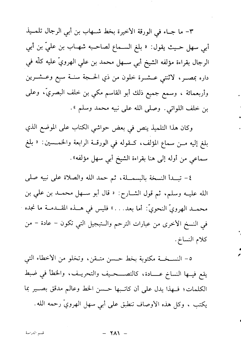 4- تبدأ النسخة بالبسملة، ثم حمد الله والصلاة على نبيه صلى الله عليه وسلم، ثم قول الشارح: "قال أبو سهل محمد بن علي بن محمد الهروي النحوي: أما بعد ... "فليس في هذه المقدمة ما نجده في النسخ الأخرى من عبارات الترحم والتبجيل التي تكون – عادة – من كلام النساخ.