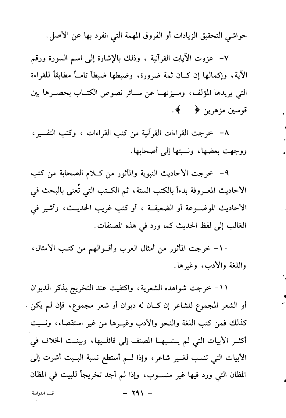 9- خرجت الأحاديث النبوية والمأثور من كلام الصحابة من كتب الأحاديث المعروفة بدءا بالكتب الستة، ثم الكتب التي تعنى بالبحث في الأحاديث الموضوعة أو الضعيفة، أو كتب غريب الحديث، وأشير في الغالب إلى لفظ الحديث كما ورد في هذه المصنفات.