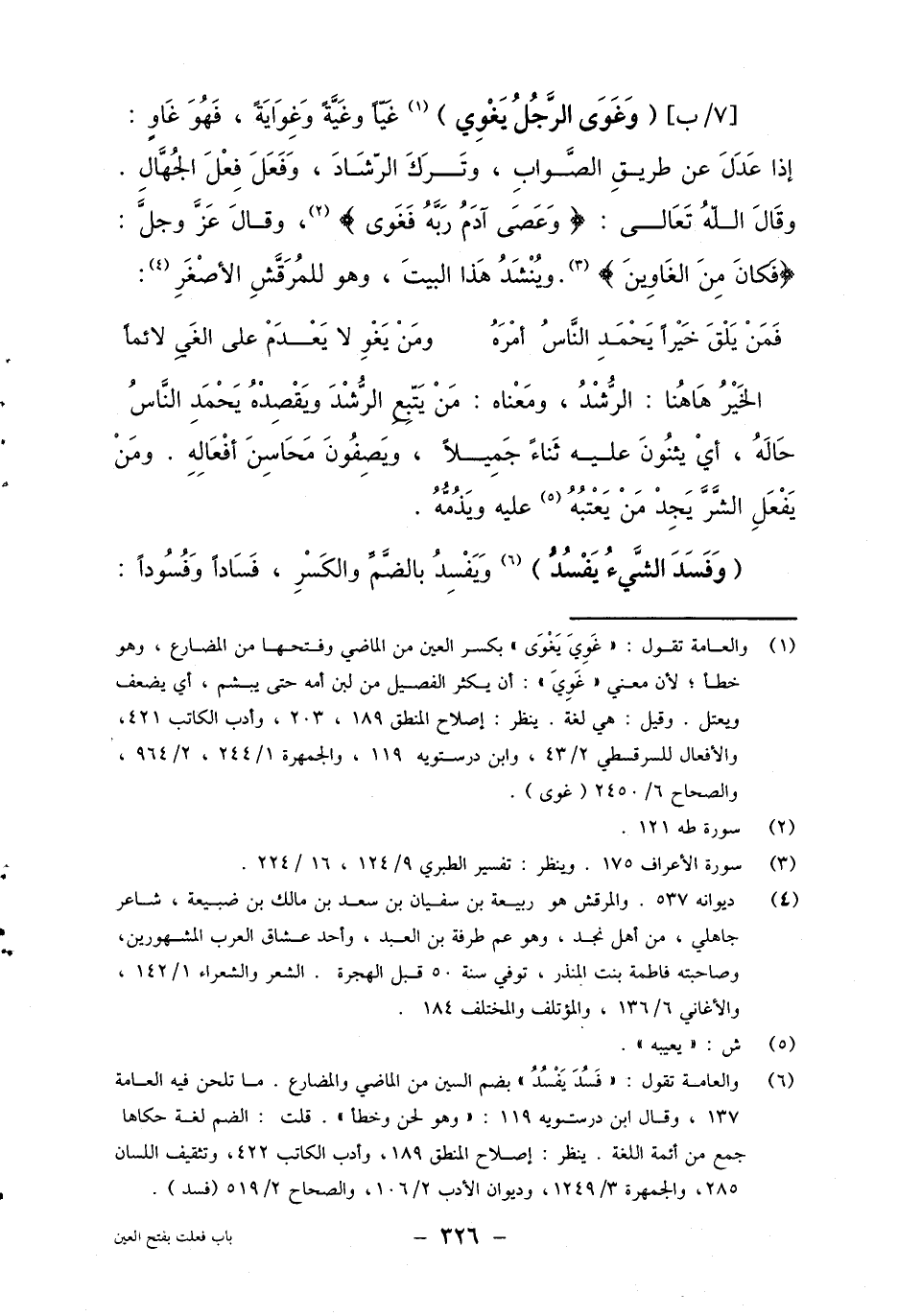 1 والعامة تقول: "غوي يغوى" بكسر العين من الماضي وفتحها من المضارع، وهو خطأ، لأن معنى "غوي": أن يكثر الفصيل من لبن أمه حتى يبشم، أي يضعف ويعتل. وقيل: هي لغة. ينظر: إصلاح المنطق 189، وأدب الكاتب 421، والأفعال للسرقسطي 2/43، وابن درستويه 119، والجمهرة 1/244، 2/964، والصحاح 6/2450 (غوى) .