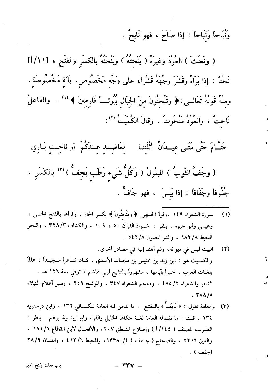 (ونحت) العود وغيره (ينحته) وينحته بالكسر والفتح، [11/أ] نحتا: إذا براه وقشر وجهه قشرا، على وجه مخصوص، بآلة مخصوصة. ومنه قوله تعالى: {وَتَنْحِتُونَ مِنَ الْجِبَالِ بُيُوتاً فَارِهِينَ} 1. والفاعل ناحت، والعود منحوت. وقال الكميت2
