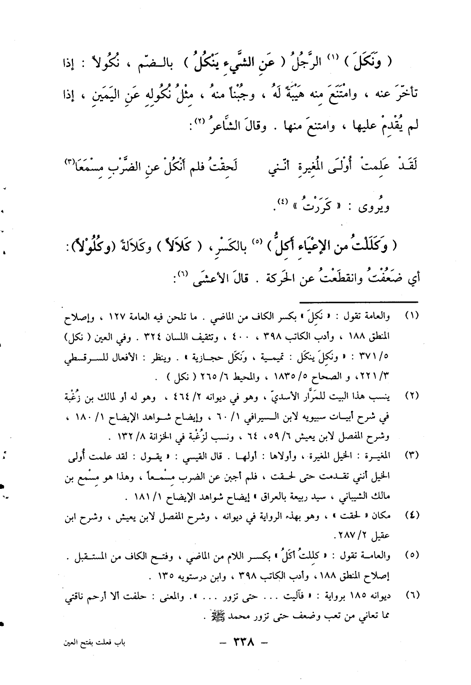 5 والعامة تقول: "كللت أكل" بكسر اللام من الماضي، وفتح الكاف من المستقبل. إصلاح المنطق 188، وأدب الكاتب 398، وابن درستويه 135.
