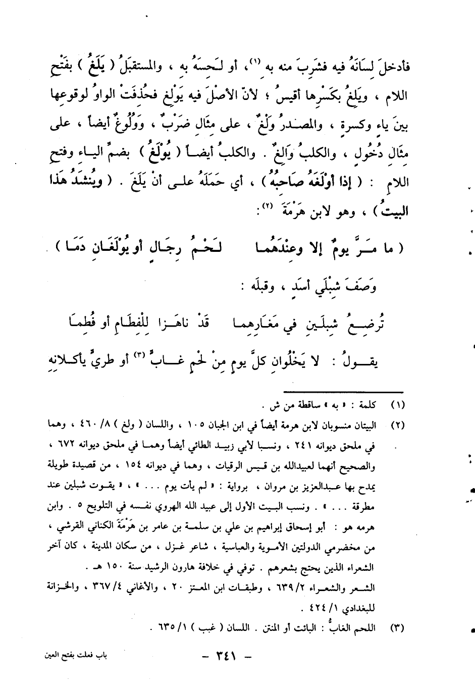 2 البيتان منسوبان لابن هرمة أيضا في ابن الجبان 105، واللسان (ولغ) 8/460، وهما في ملحق ديوانه 241، ونسبا لأبي زبيد الطائي أيضا وهما في ملحق ديوانه 672، والصحيح أنهما لعبيد الله بن قيس الرقيات، وهما في ديوانه 154، من قصيدة طويلة يمدح بها عبد العزيز بن مروان، برواية: "لم يأت يوم....."، "يقوت شبلين عند مطرقة ... ". ونسب البيت الأول إلى عبيد الله الهروي نفسه في التلويح 5. وابن هومة هو: أبو إسحاق إبراهيم بن علي بن سلمة بن عامر بن هرمة الكناني القرشي، من مخضرمي الدولتين الأموية والعباسية، شاعر غزل، من سكان المدينة، كان آخر الشعراء الذين يحتج بشعرهم. توفي في خلافة هارون الرشيد سنة 150هـ.