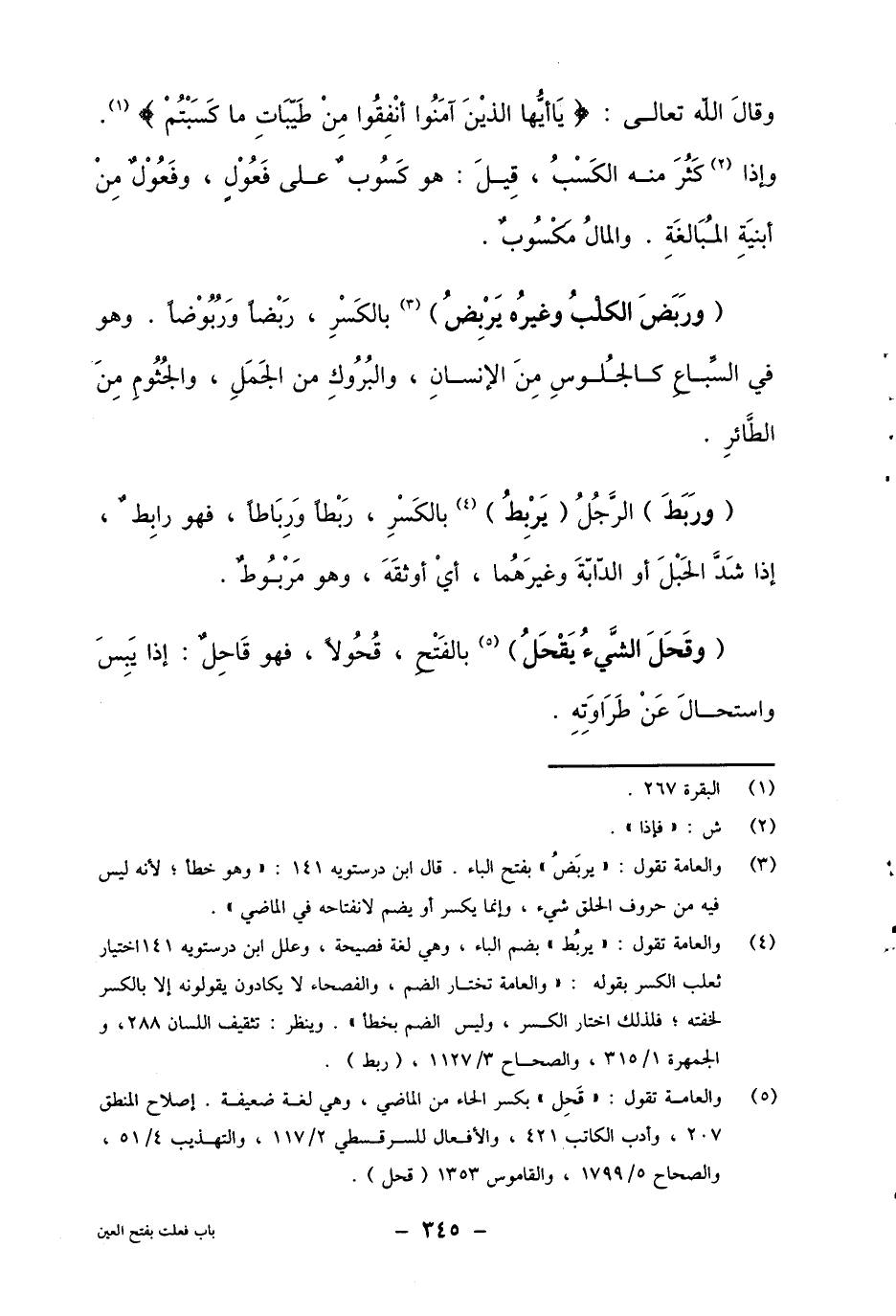 3 والعامة تقول: "يربض" بفتح الباء. قال ابن درستويه 141: "وهو خطأ، لأنه ليس فيه من الحروف الحلق شيء، وإنما يكسر أو يضم لانفتاحه في الماضي".