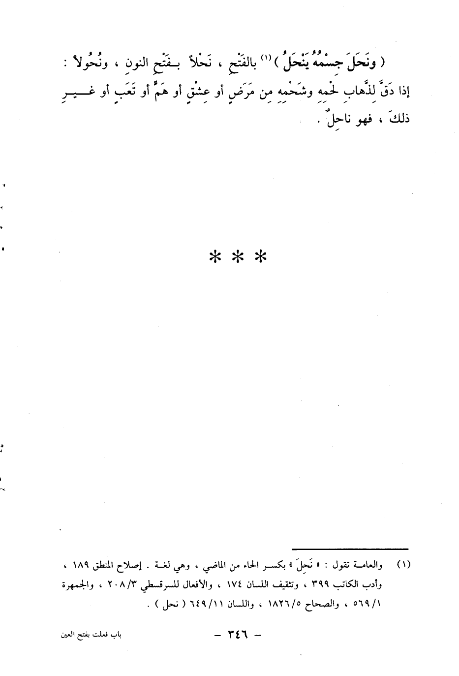 (ونحل جسمه ينحل) 1 بالفتح، نحلا بفتح النون، ونحولا: إذا دق لذهاب لحمه وشحمه من مرض أو عشق أو هم أو تعب أو غير ذلك، فهو ناحل.