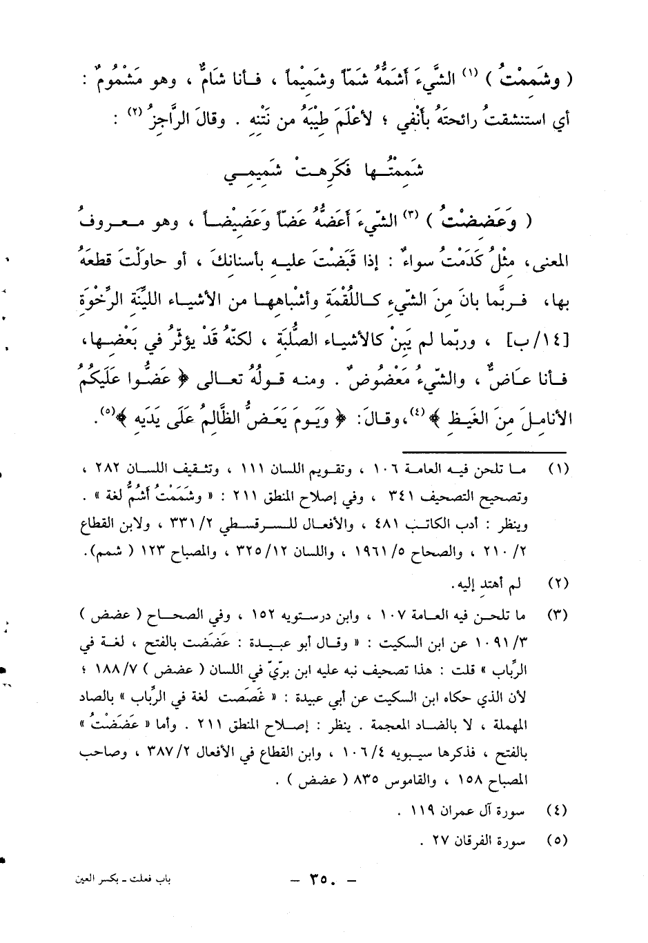 (وعضضت) 3 الشيء أعضه عضا وعضيضا، وهو معروف المعنى، مثل كدمت سواء: إذا قبضت عليه بأسنانك، أو حاولت قطعه بها، فربما بان من الشيء كاللقمة وأشباهها من الأشياء اللينة الرخوة [14/ب] ، وربما لم يبن كالأشياء الصلبة، لكنه قد يؤثر في بعضها، فأنا عاض، والشيء معضوض. ومنه قوله تعالى: {عَضُّوا عَلَيْكُمُ الأَنَامِلَ مِنَ الْغَيْظ} 4، وقال: {وَيَوْمَ يَعَضُّ الظَّالِمُ عَلَى يَدَيْه} 5.