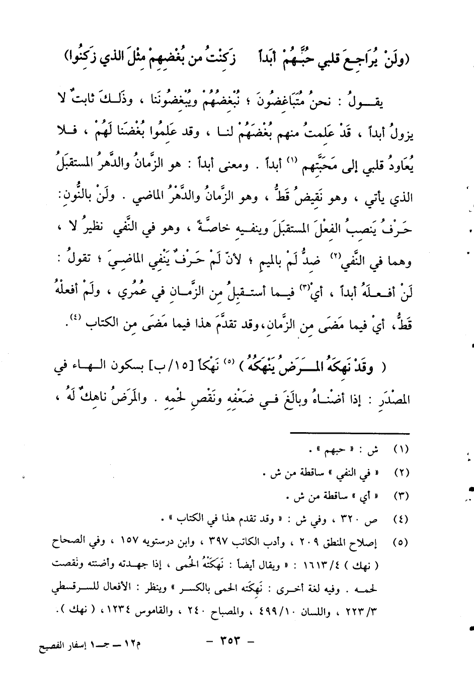 يقول: نحن متباغضون، نبغضهم ويبغضوننا، وذلك ثابت لا يزول أبدا، قد علمت منهم بغضهم لنا، وقد علموا بغضنا لهم، فلا يعاود قلبي إلى محبتهم1 أبدا. ومعنى أبدا: هو الزمان والدهر المستقبل الذي يأتي، وهو نقيض قط، وهو الزمان والدهر الماضي. ولن بالنون: حرف ينصب الفعل المستقبل وينفيه خاصة، وهو في النفي نظير لا، وهما في النفي2 ضد لم بالميم، لأن لم حرف ينفي الماضي، تقول: لن أفعله أبدا، أي3 فيما استقبل من الزمان في عمري، ولم أفعله قط، أي فيما مضي من الزمان، وقد تقدم هذا فيما مضى من الكتاب4.