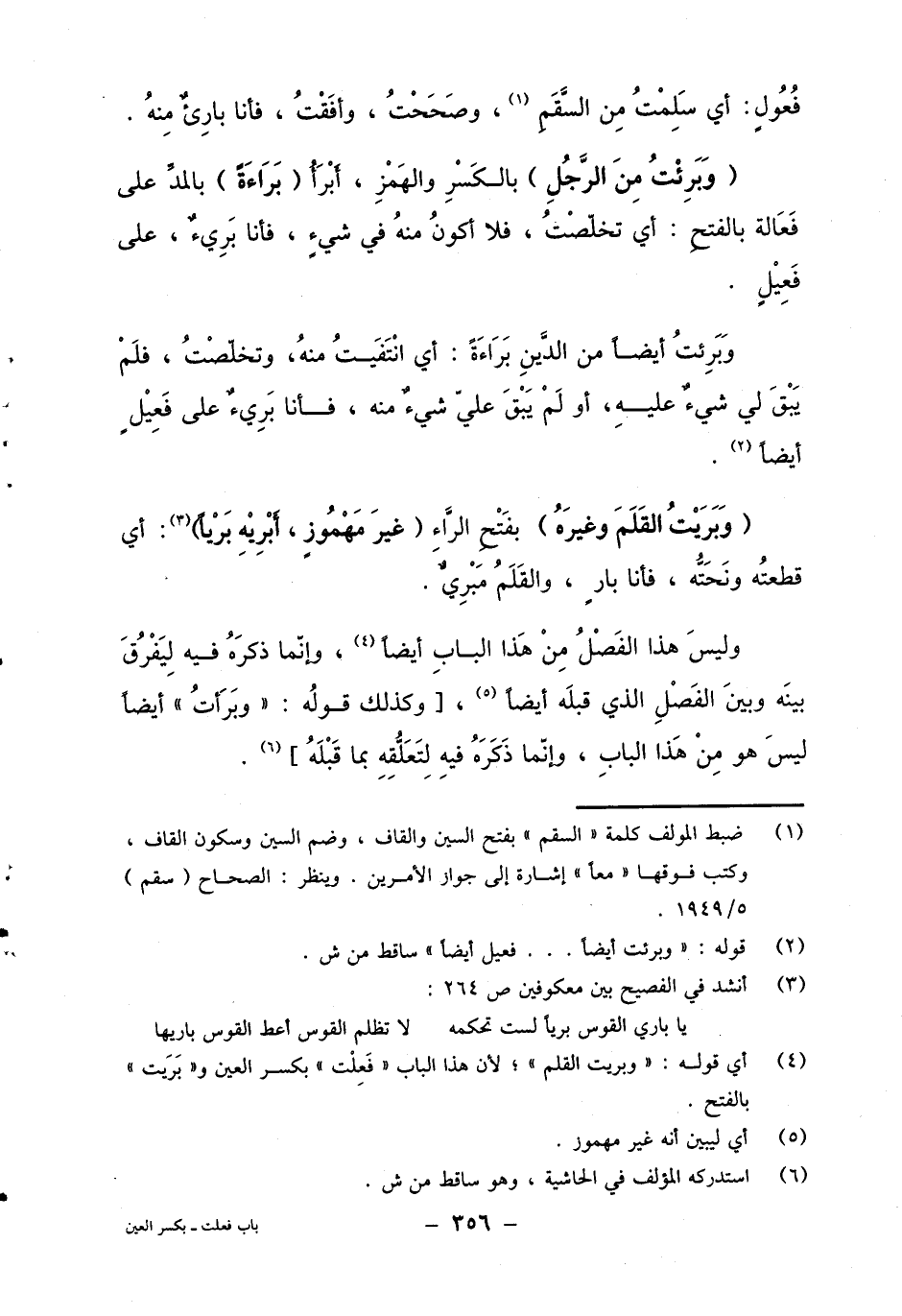 4 أي قوله: "وبريت القلم"، لأن هذا الباب "فعلت" بكسر العين و"بريت" بالفتح.