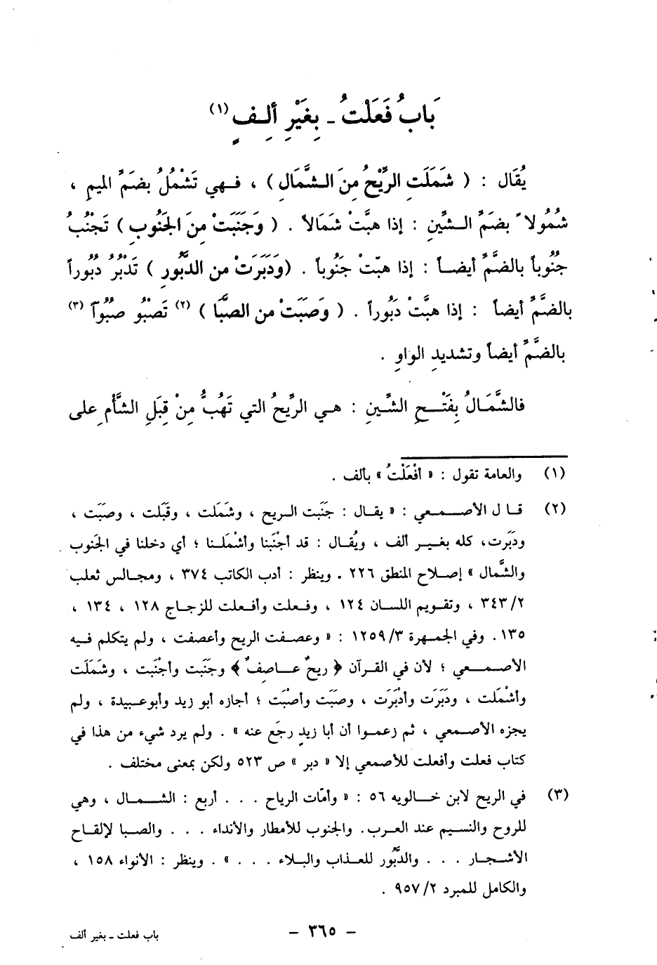 يقال: (شملت الريح من الشمال) ، فهي تشمل بضم الميم، شمولا بضم الشين: إذا هبت شمالا. (وجنبت من الجنوب) تجنب جنوبا بالضم أيضا: إذا هبت جنوبا. (ودبرت من الدبور) تدبر دبورا بالضم أيضا: إذا هبت دبورا. (وصبت من الصبا) 2 تصبو صبوا3 بالضم أيضا وتشديد الواو.