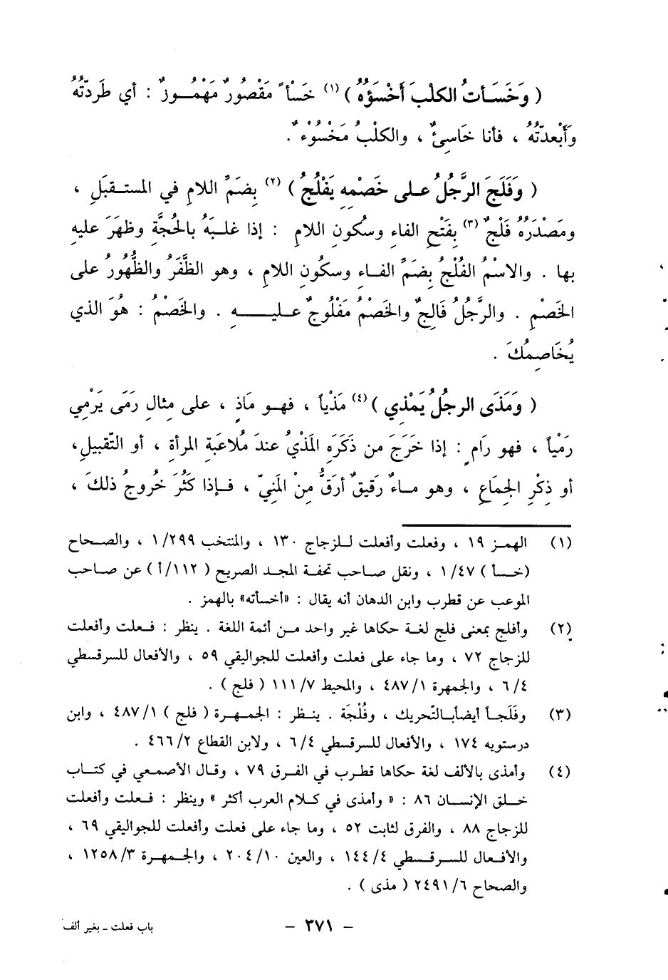 3 وفلجا أيضا بالتحريك، وفلجة. ينظر: الجمهرة (فلج) 1/487، وابن درستويه 174، والأفعال للسرقسطي 4/6، ولابن القطاع 2/466.