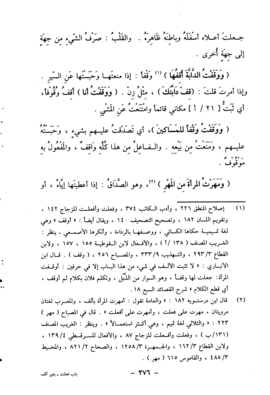 1 إصلاح المنطق 226، وأدب الكاتب 374، وفعلت وأفعلت للزجاج 142، وتقويم اللسان 182، وتصحيح التصحيف 140، ويقال أيضا: "أوقف" وهي لغة تميمية حكاها الكسائي، ووصفها بالرداءة، وأنكرها الأصمعي. نيظر: الغريب المصنف (135/أ، والأفعال لابن القوطية 155، 157، ولابن القطاع 3/293، والتهذيب 9/333، والمصباح 256، (وقف) . قال ابن الأنباري: "لا تثبت الألف في شيء من هذا الباب إلا في حرفين: أوقفت المرأة: جعلت لها وقفا، وهو السوار من الذبل، وتكلم فلان بكلام ثم أوقف، أي قطع الكلام" شرح القصائد السبع 18.