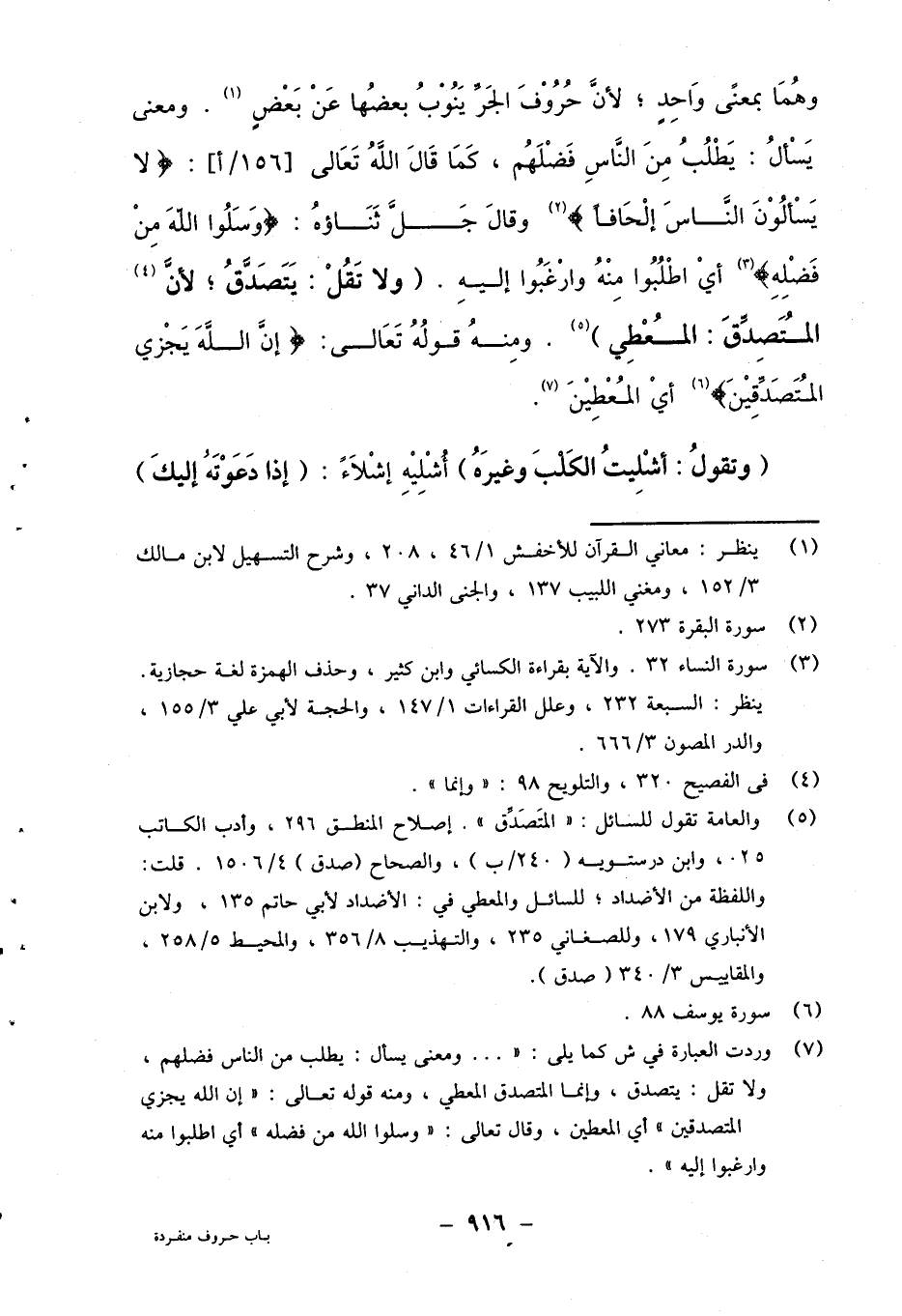 7 وردت العبارة في ش كما يلي: ".... ومعنى يسأل: يطلب من الناس فضلهم، ولا تقل: يتصدق، وإنما المتصدق المعطي، ومنه قوله تعالى: {إِنَّ اللَّهَ يَجْزِي الْمُتَصَدِّقِينَ} أي المعطين، وقال تعالى: {وَاسْأَلُوا اللَّهَ مِنْ فَضْلِه} أي اطلبوا منه وارغبوا إليه".
