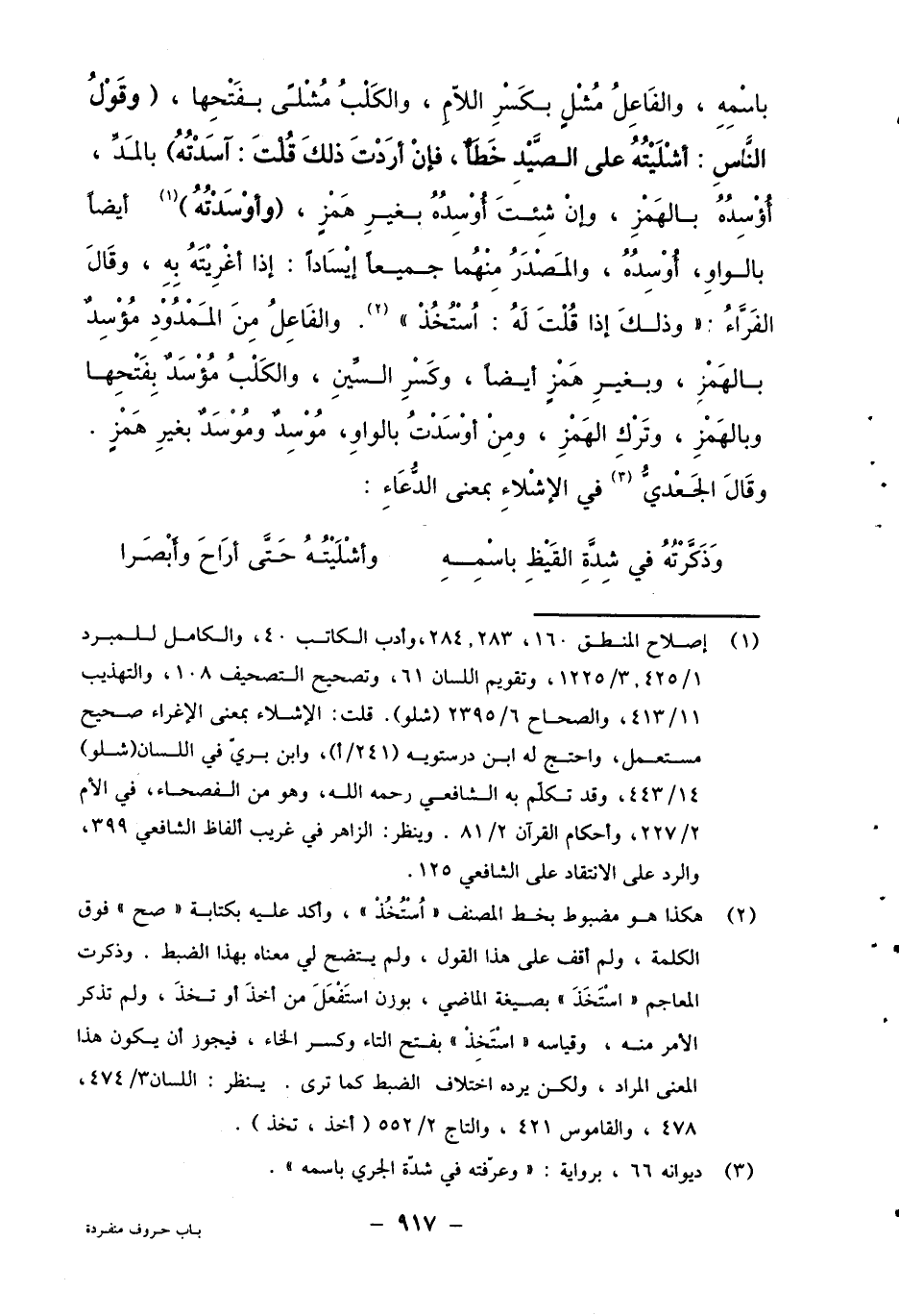 باسمه، والفاعل مشل بكسر اللام، والكلب مشلى بفتحها، (وقول الناس: أشليته على الصيد خطأ، فإن أردت ذلك قلت: آسدته) بالمد، أؤسده بالهمز، وإن شئت أوسده بغير همز، (وأوسدته) 1 أيضا بالواو، أوسده، والمصدر منهما جميعا إيسادا: إذا أغريته به، وقال الفراء: "وذلك إذا قلت له أستخذ"2. والفاعل من الممدود مؤسد الهمز، وبغير همز أيضا، وكسر السين، والكلب مؤسد بفتحها وبالهمز، وترك الهمز، ومن أوسدت بالواو، موسد موسد بغير همز. وقال الجعدي3: في الإشلاء بمعنى الدعاء: