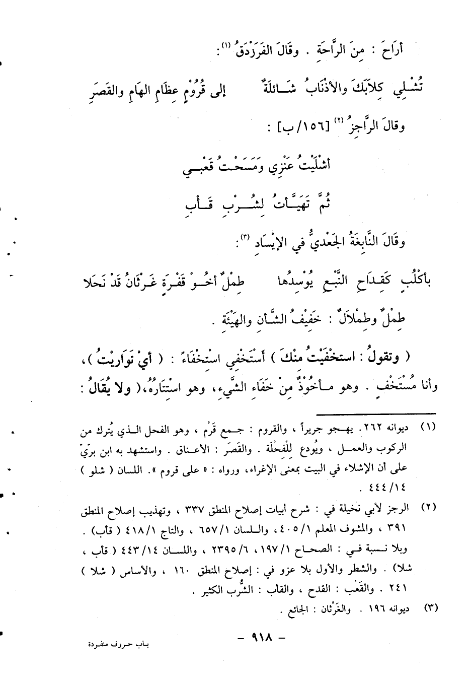 2 الرجز لأبي نخيلة في: شرح أبيات إصلاح المنطق 337، وتهذيب إصلاح المنطق 391، والمشوف المعلم 1/405، واللسان 1/657، والتاج 1/418 (قأب) . وبلا نسبة في: الصحاح 1/197، 6/2395، واللسان 14/443 (قأب، شلا) . والشطر الأول بلا عزو في: إصلاح المنطق 160، والأساس (شلا) 241. والقعب: القدح. والفأب: الشرب الكثير.