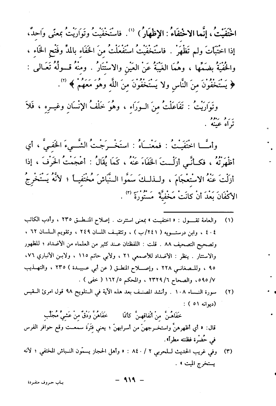 اختفيت، إنما الاختفاء: الإظهار) 1. فاستخفيت وتواريت بمعنى واحد، إذا اختبأت ولم تظهر. فاستخفيت استفعلت من الخفاء المد وفتح الخاء، والخفية بضمها، وهما الغيبة عن العين والاستتار. ومنه قوله تلعالى: {يَسْتَخْفُونَ مِنَ النَّاسِ وَلا يَسْتَخْفُونَ مِنَ اللَّهِ وَهُوَ مَعَهُمْ} 2.