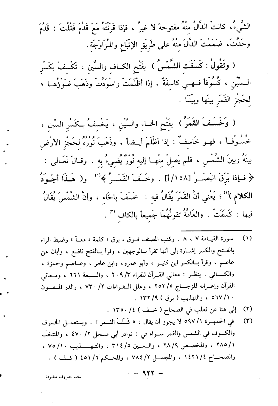 3 في الجمهرة 1/597 لا يجوز أن يقال: "كسف القمر". ويستعمل الخسوف والكسوف في الشمس والقمر سواء في: نوادر أبي مسحل 2/470، والمنتخب 1/285، والمخصص 9/28، والعين 5/314، والتهذيب 10/75، والصحاح 4/1421، والمجمل 2/784، والمحكم 6/451 (كسف) .