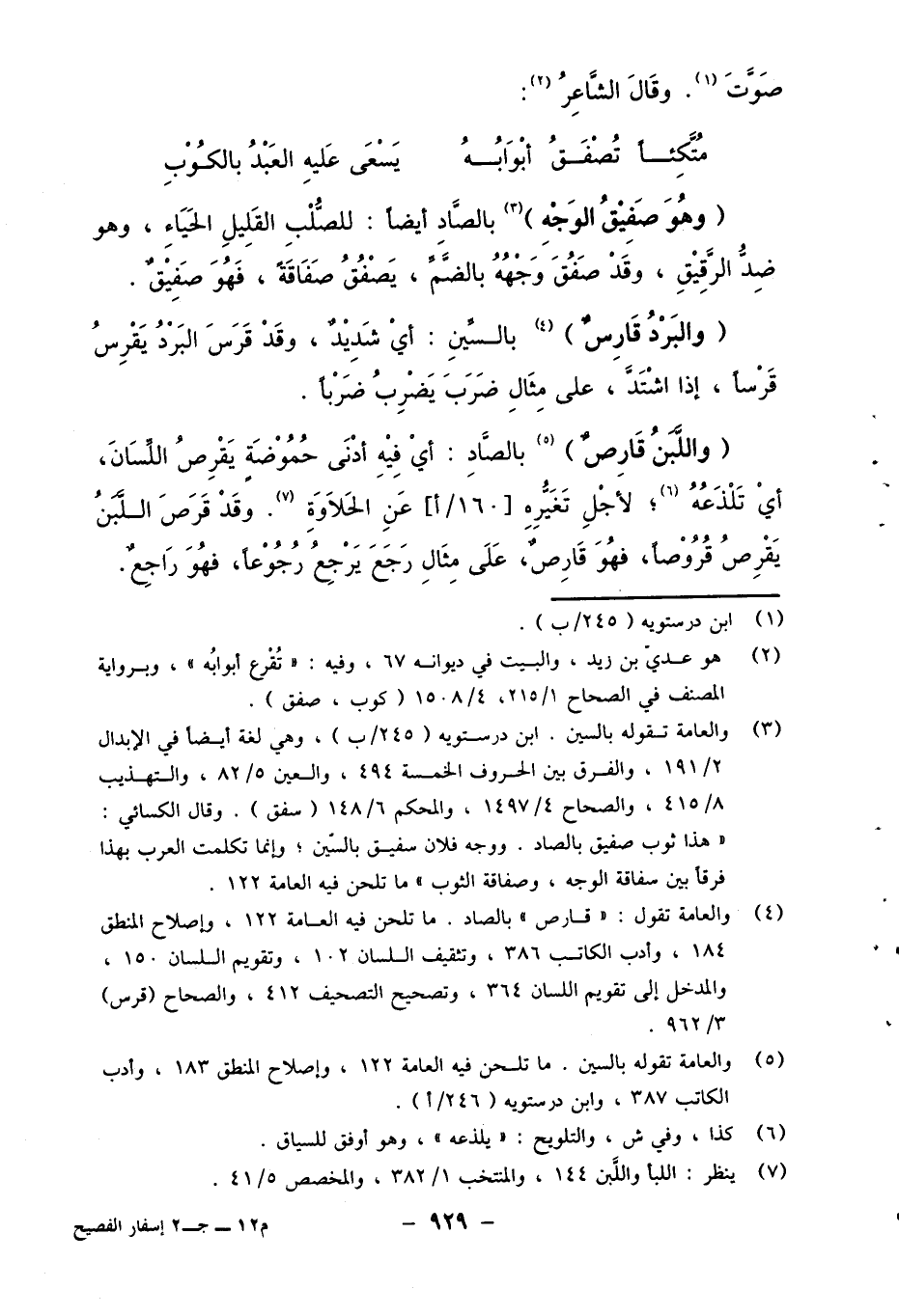 3 والعامة تقوله بالسين. ابن درستويه (245/ب) ، وهي لغة أيضا في الإبدال 2/191، والفرق بين الحروف الخمسة 494، والعين 5/82، والتهذيب 8/415، والصحاح 4/1497، والمحكم 6/148 (سفق) . وقال الكسائي: "هذا ثوب صفيق بالصاد. ووجه فلان سقيق بالسين، وإنما تكلمت العرب بهذا فرقا بين سفاقة الوجه، وصفاقة الثوب" ما تلحن فيه العامة 122.