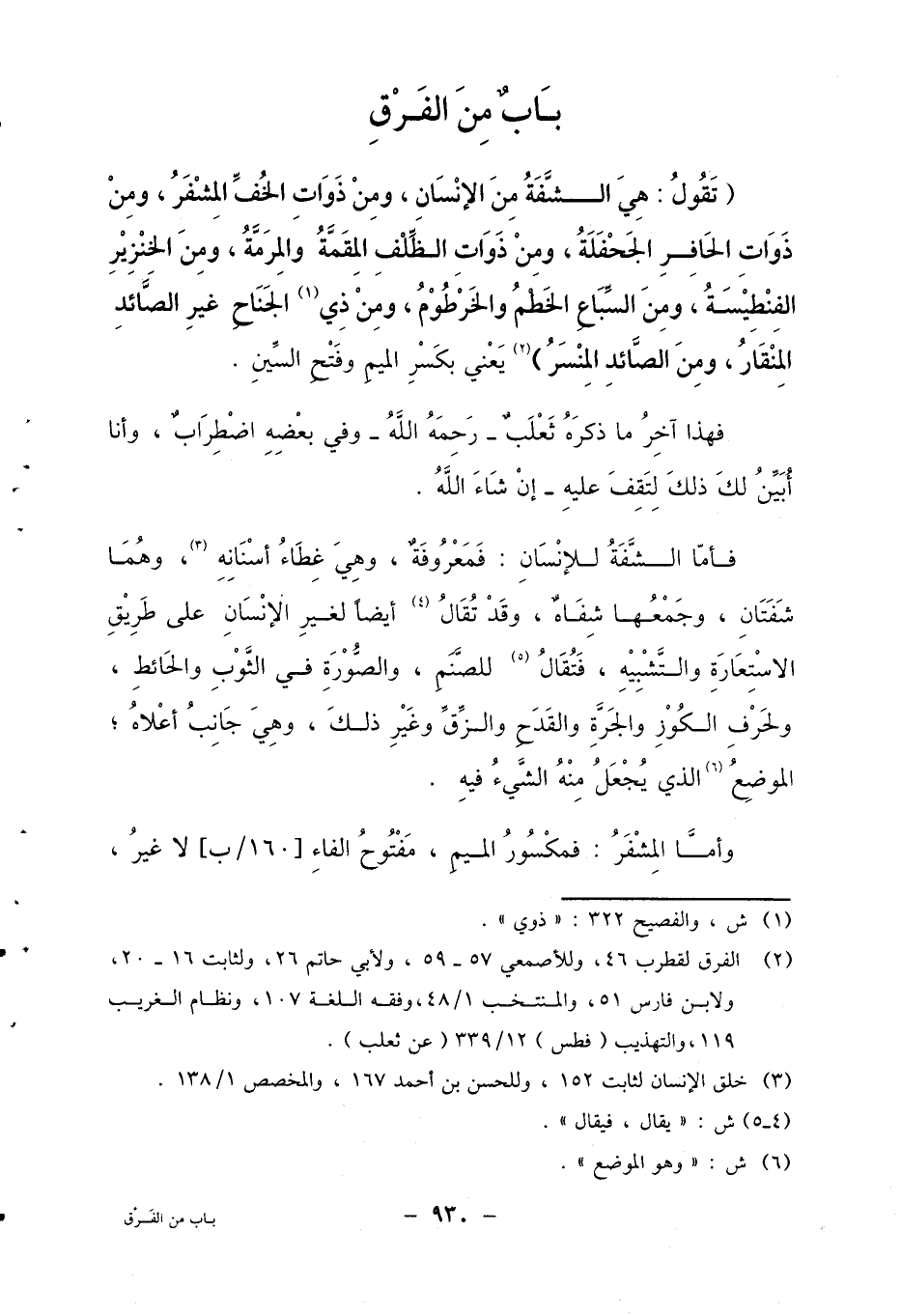 2 الفرق لقطرب 46، وللأصمعي 57-59، ولأبي حاتم 26، ولثابت 16-20، ولابن فارس 51، والمنتخب 1/48، وفقه اللغة 107، ونظام الغريب 119، والتهذيب (فطس) 12/339 (عن ثعلب) .