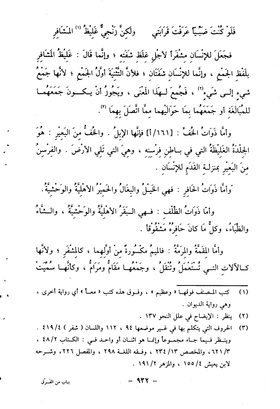 وأما ذوات الخف: [161/أ] فإنها الإبل. والخف من البعير: هو الجلدة الغليظة التي في باطن فرسنه، وهي التي تلي الأرض. والفرسن من البعير بمنزلة القدم للإنسان.
