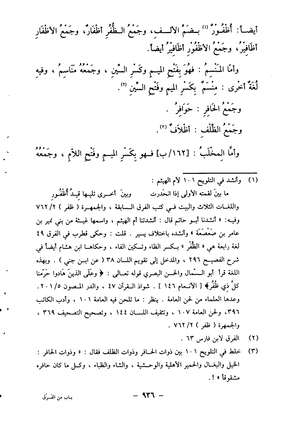 3 خلط في التلويح 101 بين ذوات الحوافر وذوات الظلف فقال: "وذوات الحوافر: الخيل والبغال والحمير الأهلية والوحشية، والشاء والظباء، وكل ما كان حافره مشقوقا"!.