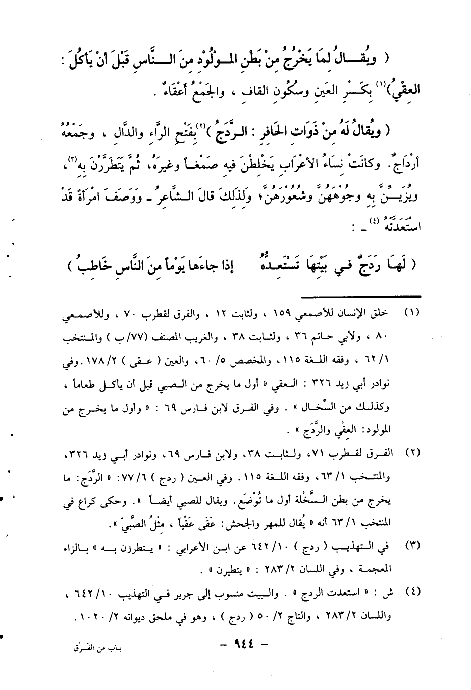2 الفرق لقطرب 71، ولثابت 38، ولابن فارس 69، ونوادر أبي زيد 326، والمنتخب 1/63ن وفقه اللغة 115. وفي العين (ردج) 6/77: "الردج: ما يخرج من بطن السخلة أول ما توضع. ويقال للصبي أيضا". وحكى كراع في المنتخب1/63 أنه "يقال للمهر والجحش: عقى عقيا، مثل الصبي".