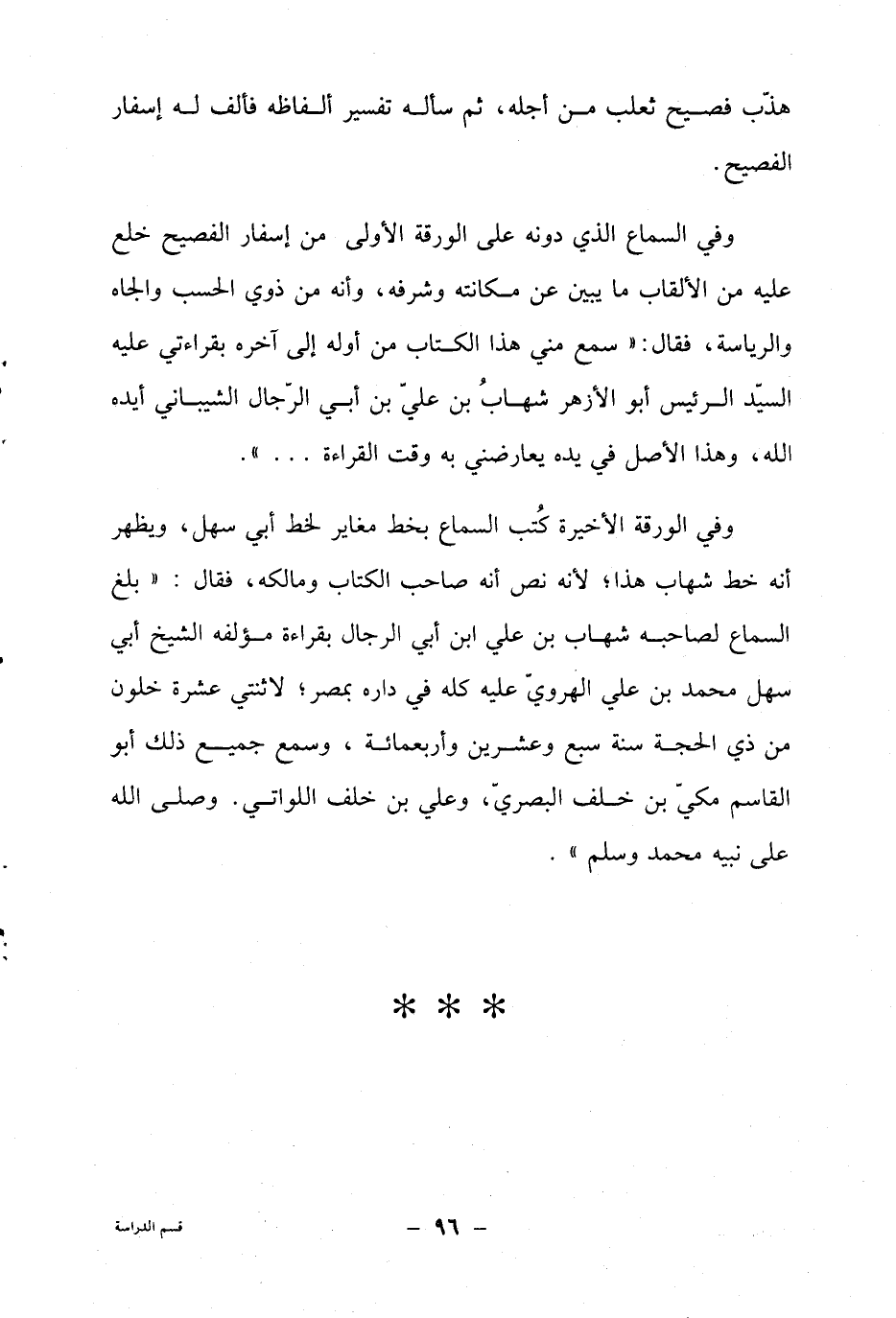 وفي الورقة الأخيرة كتب السماع بخط مغاير لخط أبي السهل، ويظهر أنه خط شهاب هذا، لأنه نص أنه صاحب الكتاب ومالكه، فقال: "بلغ السماع لصاحبه شهاب بن علي ابن أبي الرجال بقراءة مؤلفه الشيخ أبي سهل محمد بن علي الهروي عليه كله في داره بمصر، لاثنتي عشرة خلون من ذي الحجة سنة سبع وعشرين وأربعمائة، وسمع جميع ذلك أبو القاسم مكي بن خلف البصري، وعلي بن خلف اللواتي. وصلى الله على نبيه محمد وسلم".