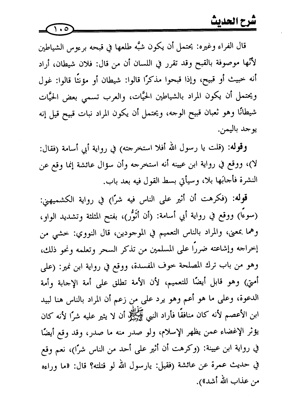 قوله: (فكرهت أن أثير على الناس فيه شرًا) في رواية الكشميهني: (سوءًا) ووقع في رواية أبي أسامة: (أن أثوّر)، بفتح المثلثة وتشديد الواو، وهما بمعنى، والمراد بالناس التعميم في الموجودين، قال النووي: خشي من إخراجه وإشاعته ضررًا على المسلمين من تذكر السحر وتعلمه ونحو ذلك، وهو من باب ترك المصلحة خوف المفسدة، ووقع في رواية ابن نمير: (على أمتي) وهو قابل أيضًا للتعميم، لأن الأمة تطلق على أمة الإجابة وأمة الدعوة، وعلى ما هو أعم وهو يرد على من زعم أن المراد بالناس هنا لبيد ابن الأعصم لأنه كان منافقًا فأراد النبي صلى الله عليه وعلى آله وسلم أن لا يثير عليه شرًا لأنه كان يؤثر الإغضاء عمن يظهر الإسلام، ولو صدر منه ما صدر، وقد وقع أيضًا في رواية ابن عيينة: (وكرهت أن أثير على أحد من الناس شرًا)، نعم وقع في حديث عمرة عن عائشة (فقيل: يارسول الله لو قتلته؟ قال: ((ما وراءه من عذاب الله أشد))).