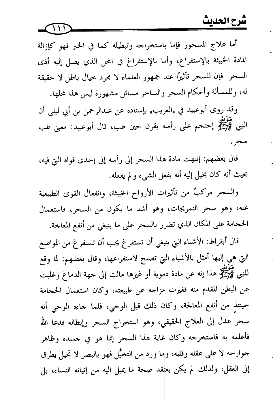 وقد روى أبوعبيد في "الغريب" بإسناده عن عبد الرحمن بن أبي ليلى أن النبي صلى الله عليه وعلى آله وسلم إحتجم على رأسه بقرن حين طب، قال أبوعبيد: معنى طب سحر.