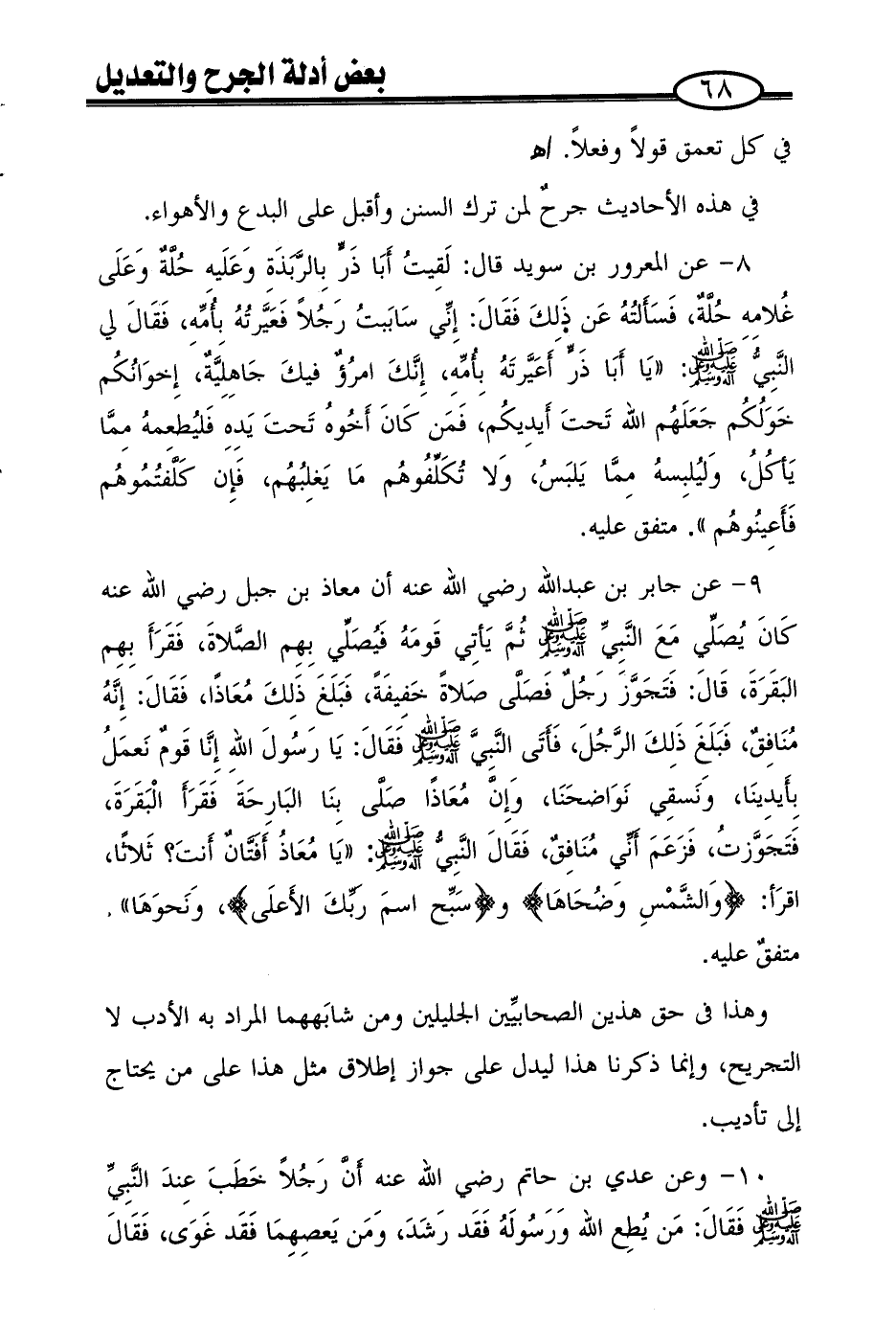 8 - عن المعرور بن سويد قال: لقيت أبا ذرّ بالرّبذة وعليه حلّة وعلى غلامه حلّة، فسألته عن ذلك فقال: إنّي ساببت رجلاً فعيّرته بأمّه، فقال لي النّبيّ صلى الله عليه وعلى آله وسلم: ((يا أبا ذرّ أعيّرته بأمّه، إنّك امرؤ فيك جاهليّة، إخوانكم خولكم جعلهم الله تحت أيديكم، فمن كان أخوه تحت يده فليطعمه ممّا يأكل، وليلبسه ممّا يلبس، ولا تكلّفوهم ما يغلبهم، فإن كلّفتموهم فأعينوهم)). متفق عليه.