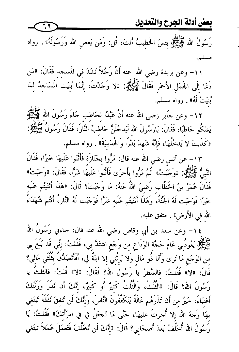 14 - وعن سعد بن أبي وقاص رضي الله عنه قال: جاءني رسول الله صلى الله عليه وعلى آله وسلم يعودني عام حجّة الوداع من وجع اشتدّ بي، فقلت: إنّي قد بلغ بي من الوجع ما ترى وأنا ذو مال ولا يرثني إلا ابنة لي، أفأتصدّق بثلثي مالي؟ قال: ((لا)) فقلت: فالشّطر يا رسول الله؟ فقال: ((لا)) قلت: فالثلث يا رسول الله؟ قال: ((الثّلث، والثّلث كثير أو كبير، إنّك أن تذر ورثتك أغنياء، خير من أن تذرهم عالةً يتكفّفون النّاس، وإنّك لن تنفق نفقةً تبتغي بها وجه الله إلا أجرت عليها، حتّى ما تجعل في في امرأتك)) فقلت: يا رسول الله أخلّف بعد أصحابي؟ قال: ((إنّك لن تخلّف فتعمل عملاً تبتغي