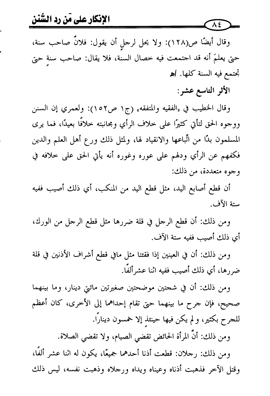 ومن ذلك: رجلان: قطعت أذنا أحدهما جميعًا، يكون له اثنا عشر ألفًا، وقتل الآخر فذهبت أذناه وعيناه ويداه ورجلاه وذهبت نفسه، ليس ذلك