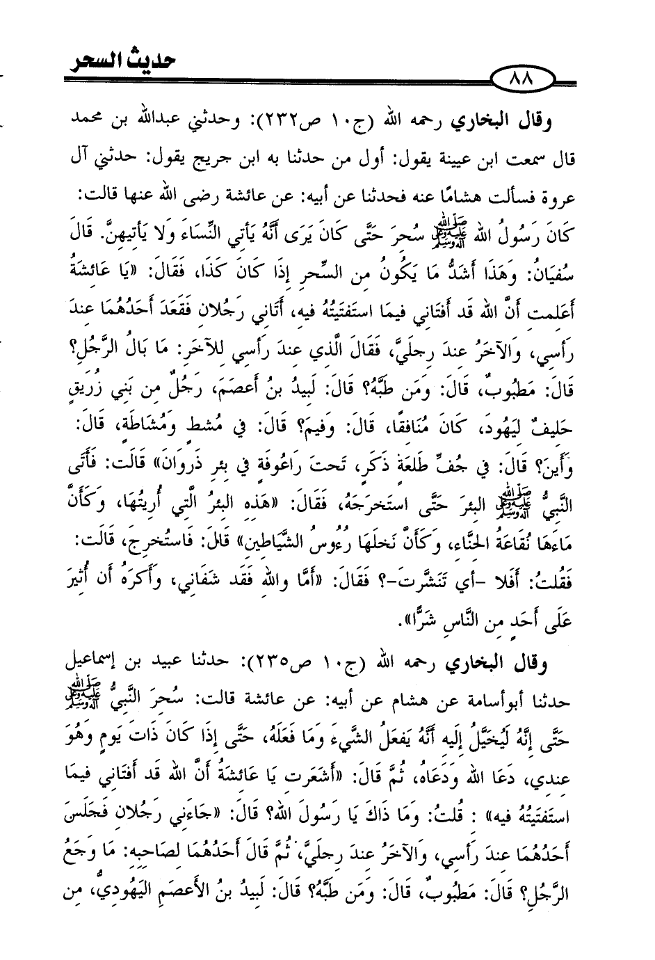 وقال البخاري رحمه الله (ج10 ص235): حدثنا عبيد بن إسماعيل حدثنا أبوأسامة عن هشام عن أبيه: عن عائشة قالت: سحر النّبيّ صلى الله عليه وعلى آله وسلم حتّى إنّه ليخيّل إليه أنّه يفعل الشّيء وما فعله، حتّى إذا كان ذات يوم وهو عندي، دعا الله ودعاه، ثمّ قال: ((أشعرت يا عائشة أنّ الله قد أفتاني فيما استفتيته فيه)): قلت: وما ذاك يا رسول الله؟ قال: ((جاءني رجلان فجلس أحدهما عند رأسي، والآخر عند رجليّ، ثمّ قال أحدهما لصاحبه: ما وجع الرّجل؟ قال: مطبوب، قال: ومن طبّه؟ قال: لبيد بن الأعصم اليهوديّ، من
