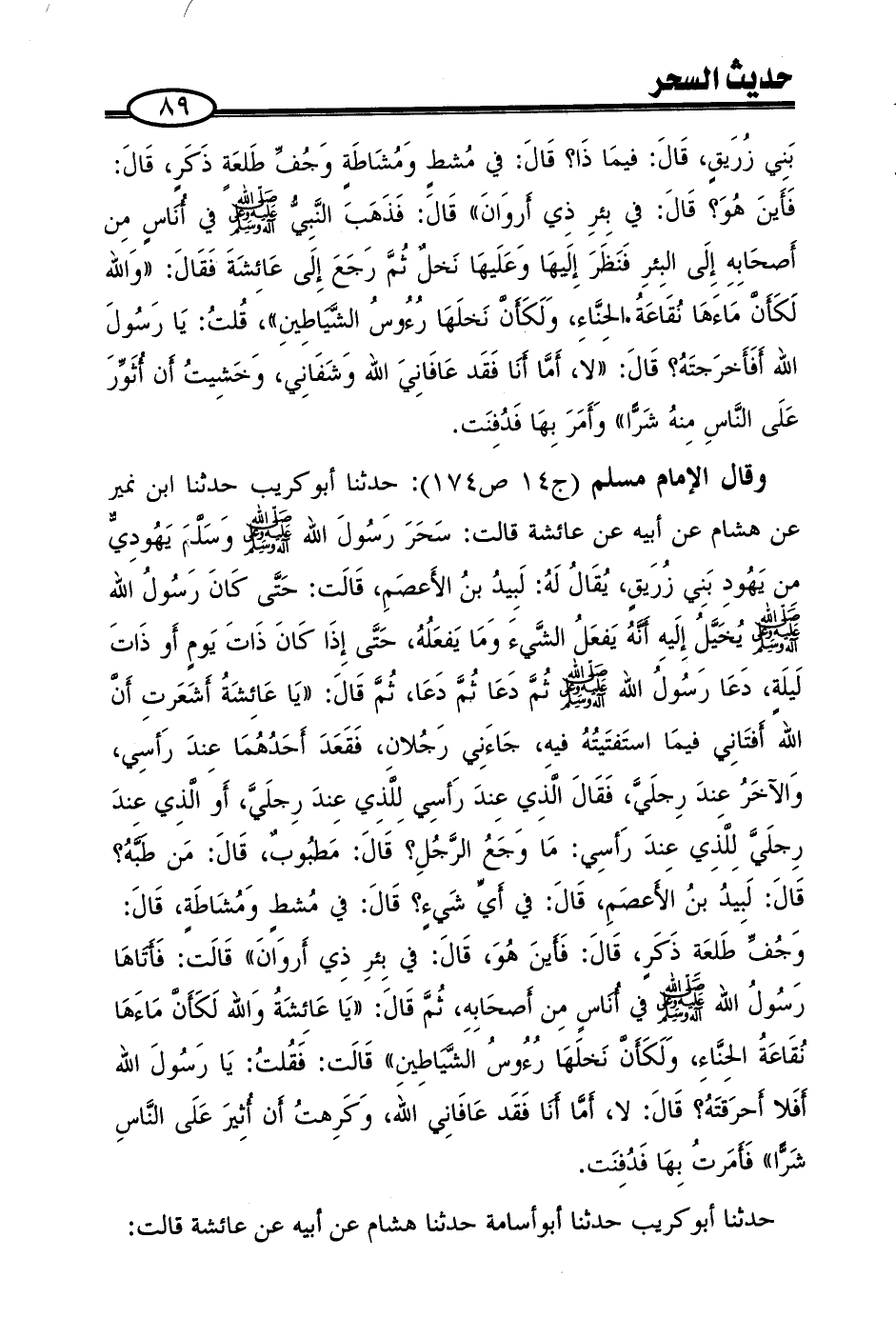 وقال الإمام مسلم (ج14 ص174): حدثنا أبوكريب حدثنا ابن نمير عن هشام عن أبيه عن عائشة قالت: سحر رسول الله صلى الله عليه وعلى آله وسلم وسلّم يهوديّ من يهود بني زريق، يقال له: لبيد بن الأعصم، قالت: حتّى كان رسول الله صلى الله عليه وعلى آله وسلم يخيّل إليه أنّه يفعل الشّيء وما يفعله، حتّى إذا كان ذات يوم أو ذات ليلة، دعا رسول الله صلى الله عليه وعلى آله وسلم ثمّ دعا ثمّ دعا، ثمّ قال: ((يا عائشة أشعرت أنّ الله أفتاني فيما استفتيته فيه، جاءني رجلان، فقعد أحدهما عند رأسي، والآخر عند رجليّ، فقال الّذي عند رأسي للّذي عند رجليّ، أو الّذي عند رجليّ للّذي عند رأسي: ما وجع الرّجل؟ قال: مطبوب، قال: من طبّه؟ قال: لبيد بن الأعصم، قال: في أيّ شيء؟ قال: في مشط ومشاطة، قال: وجفّ طلعة ذكر، قال: فأين هو، قال: في بئر ذي أروان)) قالت: فأتاها رسول الله صلى الله عليه وعلى آله وسلم في أناس من أصحابه، ثمّ قال: ((يا عائشة والله لكأنّ ماءها نقاعة الحنّاء، ولكأنّ نخلها رءوس الشّياطين)) قالت: فقلت: يا رسول الله أفلا أحرقته؟ قال: لا، أمّا أنا فقد عافاني الله، وكرهت أن أثير على النّاس شرًّا)) فأمرت بها فدفنت.