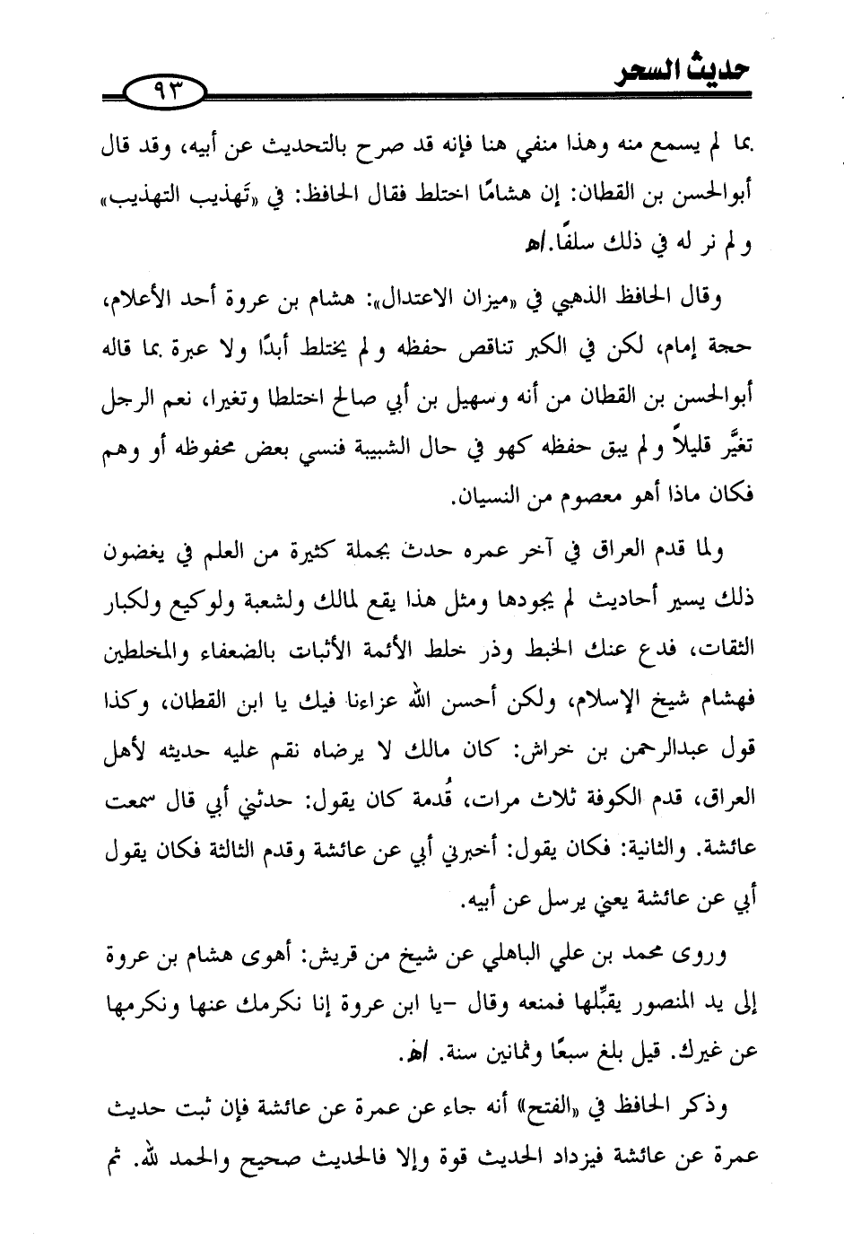 وقال الحافظ الذهبي في "ميزان الاعتدال": هشام بن عروة أحد الأعلام، حجة إمام، لكن في الكبر تناقص حفظه ولم يختلط أبدًا ولا عبرة بما قاله أبوالحسن بن القطان من أنه وسهيل بن أبي صالح اختلطا وتغيرا، نعم الرجل تغيّر قليلاً ولم يبق حفظه كهو في حال الشبيبة فنسي بعض محفوظه أو وهم فكان ماذا أهو معصوم من النسيان.
