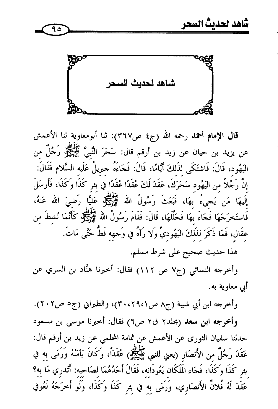 قال الإمام أحمد رحمه الله (ج4 ص367): ثنا أبومعاوية ثنا الأعمش عن يزيد بن حيان عن زيد بن أرقم قال: سحر النّبيّ صلى الله عليه وعلى آله وسلم رجل من اليهود، قال: فاشتكى لذلك أيّامًا، قال: فجاءه جبريل عليه السّلام فقال: إنّ رجلاً من اليهود سحرك، عقد لك عقدًا عقدًا في بئر كذا وكذا، فأرسل إليها من يجيء بها، فبعث رسول الله صلى الله عليه وعلى آله وسلم عليًّا رضي الله عنه، فاستخرجها فجاء بها فحلّلها، قال: فقام رسول الله صلى الله عليه وعلى آله وسلم كأنّما نشط من عقال، فما ذكر لذلك اليهوديّ ولا رآه في وجهه قطّ حتّى مات.