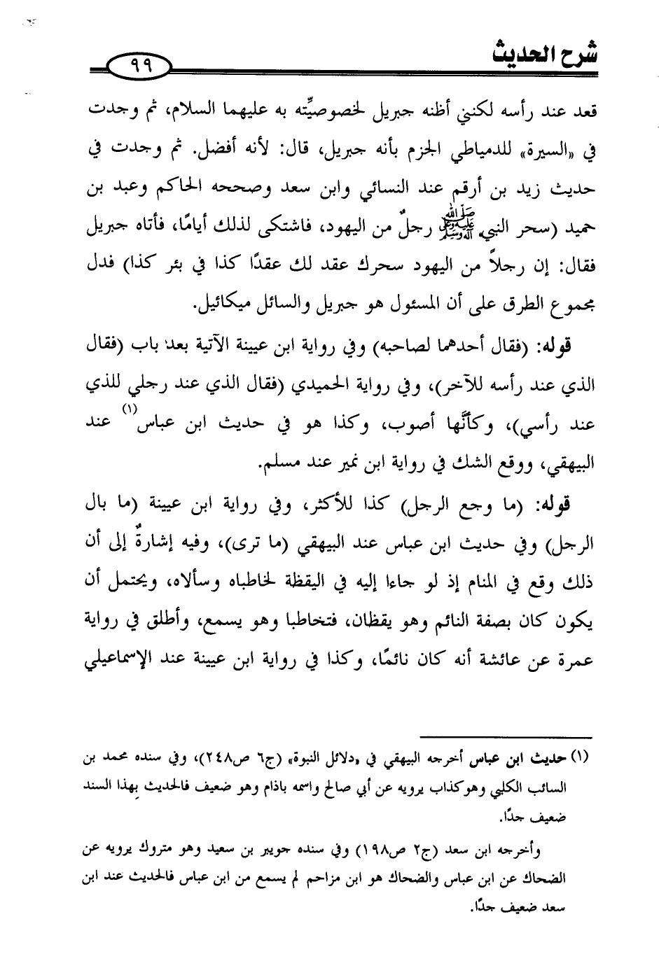 قعد عند رأسه لكنني أظنه جبريل لخصوصيّته به عليهما السلام، ثم وجدت في "السيرة" للدمياطي الجزم بأنه جبريل، قال: لأنه أفضل. ثم وجدت في حديث زيد بن أرقم عند النسائي وابن سعد وصححه الحاكم وعبد بن حميد (سحر النبي صلى الله عليه وعلى آله وسلم رجل من اليهود، فاشتكى لذلك أيامًا، فأتاه جبريل فقال: إن رجلاً من اليهود سحرك عقد لك عقدًا كذا في بئر كذا) فدل مجموع الطرق على أن المسئول هو جبريل والسائل ميكائيل.