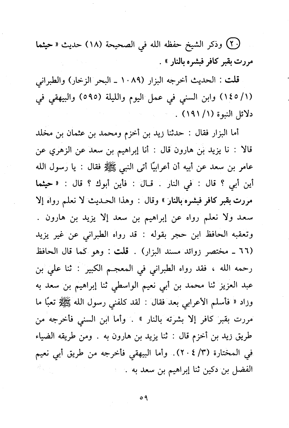 وتعقبه الحافظ ابن حجر بقوله: قد رواه الطبراني عن غير يزيد (66 - مختصر الزوائد مسند البزار) قلت: وهو كما قال الحافظ رحمه الله، فقد رواه الطبراني في المعجم الكبير: ثنا علي بن عبد العزيز ثنا محمد بن أبي نعيم الواسطي ثنا إبراهيم بن سعد به وزاد فأسلم الأعرابي بعد فقال: لقد كلفني رسول الله - صلى الله عليه وسلم - تعبًا ما مررت بقبر كافر إلا بشرته بالنار. وأما ابن السني فأخرجه من طريق زيد بن أخزم قال: ثنا يزيد بن هارون به. ومن طريقه الضياء في المختارة (3/ 204). وأما البيهقي فأخرجه من طريق أبي نعيم الفضل بن دكين ثنا إبراهيم بن سعد به.