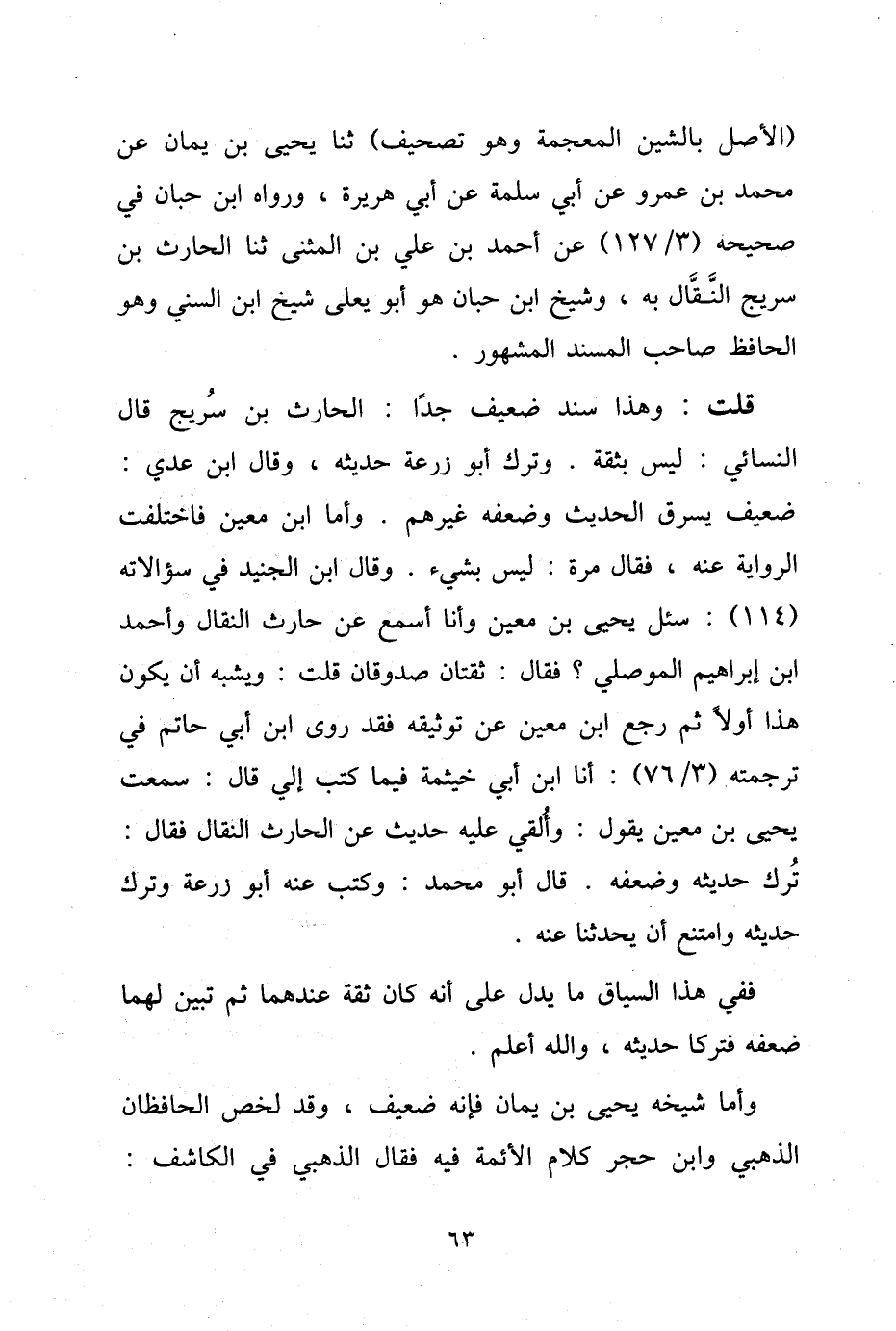 قلت: وهذا سند ضعيف جدًا: الحارث بن سُريج قال النسائي: ليس بثقة. وترك أبو زرعة حديثه، وقال ابن عدي: ضعيف يسرق الحديث وضعفه غيرهم. وأما ابن معين فاختلفت الرواية عنه، فقال مرة: ليس بشيء. وقال ابن الجنيد في سؤالاته (114): سئل يحيى بن معين وأنا أسمع عن حارث النقال وأحمد ابن إبراهيم الموصلي؟ فقال: ثقتان صدوقان قلت: ويشبه أن يكون هذا أولاً ثم رجع ابن معين عن توثيقه فقد روى ابن أبي حاتم في ترجمته (3/ 76): أنا ابن أبي خيثمة فيما كتب إلي قال: سمعت يحيى بن معين يقول: وأُلقي عليه حديث عن الحارث النقال فقال: تُرك حديثه وضعفه. قال أبو محمد: وكتب عنه أبو زرعة وترك حديثه وامتنع أن يحدثنا عنه.