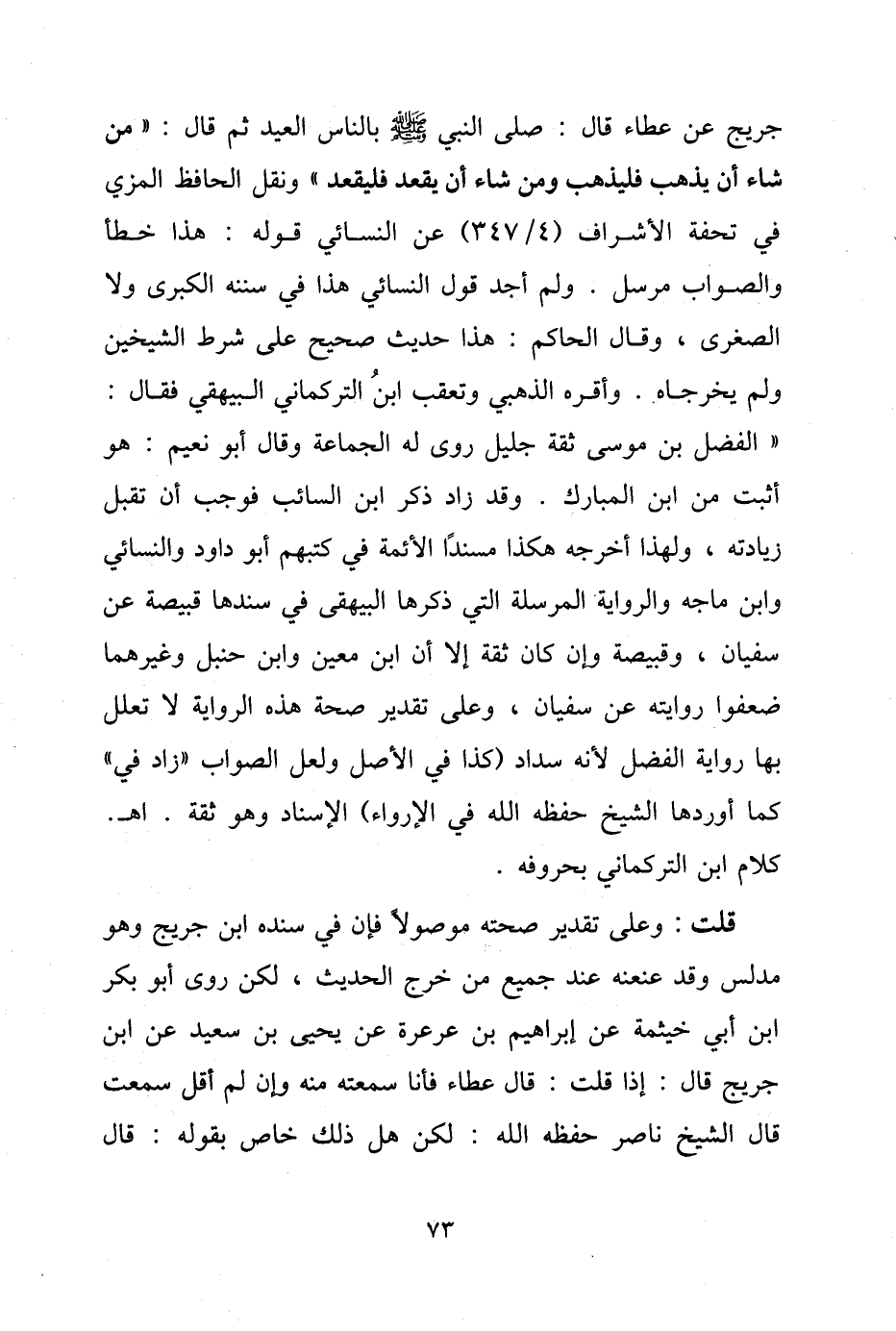 جريج عن عطاء قال صلى النبي صلى الله عليه وسلم بالناس العيد ثم قال: «من شاء أن يذهب فليذهب ومن شاء أن يقعد فليقعد»، ونقل الحافظ المزيْ في تحفة الأشراف (4/ 347) عن النسائي قوله: هذا خطأ والصواب مرسل. ولم أجد قول النسائي هذا في سننه الكبرى ولا الصغرى، وقال الحاكم: هذا حديث صحيح على شرط الشيخين ولم يخرجاه: وأقره الذهبي وتعقب ابنُ التركماني البيهقي فقال: الفضل بن موسى ثقة جليل روى له الجماعة وقال أبو نعيم: هو أثبت من ابن المبارك. وقد زاد ذكر ابن السائب فوجب أن تقبل زيادته، ولهذا أخرجه هكذا مسندًا الأئمة في كتبهم أبو داود والنسائي وابن ماجه والرواية المرسلة التي ذكرها البيهقي في سندها قبيصة عن سفيان، وقبيصة وإن كان ثقة إلا إن ابن معين وابن حنبل وغيرهما ضعفوا روايته عن سفيان، وعلى تقدير صحة هذه الرواية لا تعلل بها رواية الفضل لأنه سداد (كذا في الأصل ولعل الصواب "زاد في" كما أوردها الشيخ في الإرواء) الإسناد وهو ثقة. اهـ.