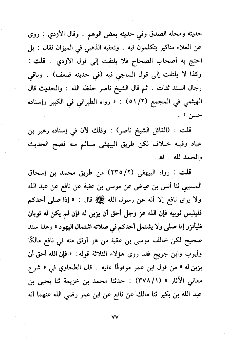 قلت: رواه البيهقي (2/ 235) من طريق محمد بن إسحاق المسيبي ثنا أنس بن عياض عن موسى بن عقبة عن نافع عن عبد الله ولا يرى نافع إلا أنه عن رسول الله - صلى الله عليه وسلم - قال: «إذا صلى أحدكم فليلبس ثوبيه فإن الله أحق أن يزين له فإن لم يكن له ثوبان فليأتزر إذا صلى ولا يشتمل أحدكم في صلاته اشتمال اليهود»، وهذا سند صحيح لكن خالف موسى بن عقبة من هو أوثق منه في نافع مالكًا وأيوب وابن جريج فقد روى هؤلاء الثلاثة قوله: «فإن الله أحق أن يزين له»، من قول ابن عمر موقوفًا عليه، قال الطحاوي في "شرح معاني الآثار" (1/ 378): حدثنا محمد بن خزيمة ثنا يحيى بن عبد الله بن بكير ثنا عن نافع عن ابن عمر رضي الله عنهما أنه
