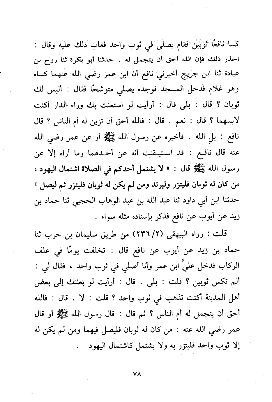 كسا نافعًا ثوبين فقام يصلي في ثوب واحد فعاب ذلك عليه وقال: احذر ذلك فإن الله أحق أن يتجمل له. حدثنا أبو بكرة ثنا روح بن عبادة ثنا ابن جريج أخبرني نافع أن ابن عمر رضي الله عنهما كساه وهو غلام فدخل المسجد فوجده متوشحًا فقال: أليس لك ثوبان؟ قال: بلى قال: أرأيت لو استعنت بك وراء الدار أكنت لابسهما؟ قال: نعم، قال: فالله أحق أن تزين له أم الناس؟ قال نافع: بلِ الله. فأخبره عن رسول الله - صلى الله عليه وسلم - أو عن عمر رضي الله عنه قال نافع: قد استيقنت أنه عن أحدهما وما أراه إلا عن رسول الله - صلى الله عليه وسلم - قال: «لا يشتمل أحدكم في الصلاة اشتمال اليهود، من كان له ثوبان فليتزر وليرتد ومن لم يكن له ثوبان فليتزر ثم ليصل»، حدثنا ابن أبي داود ثنا عبد الله بن عبد الوهاب الحجبي ثنا حماد بن زيد عن أيوب عن نافع فذكر بإسناده مثله سواء.