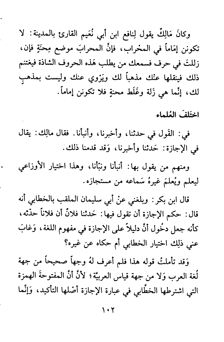 وكانَ مَالِك يقول لِنافع بن أبي نُعَيم القارئ بالمدينة: لا تكونن إمَاماً في المحْراب، فإنَّ المحرابَ موضع مِحنَةٍ فإن، زللتَ في حرف فسمعك من يطلب هَذه الحروف الشاذة فيغتنم ذلك فينقلها عنْك مذهباً لك وَيرْوي عنك وليست بمذهبٍ لك، إنّما هي زَلة وغَلَط محنةٍ فلا تكونن إماماً.