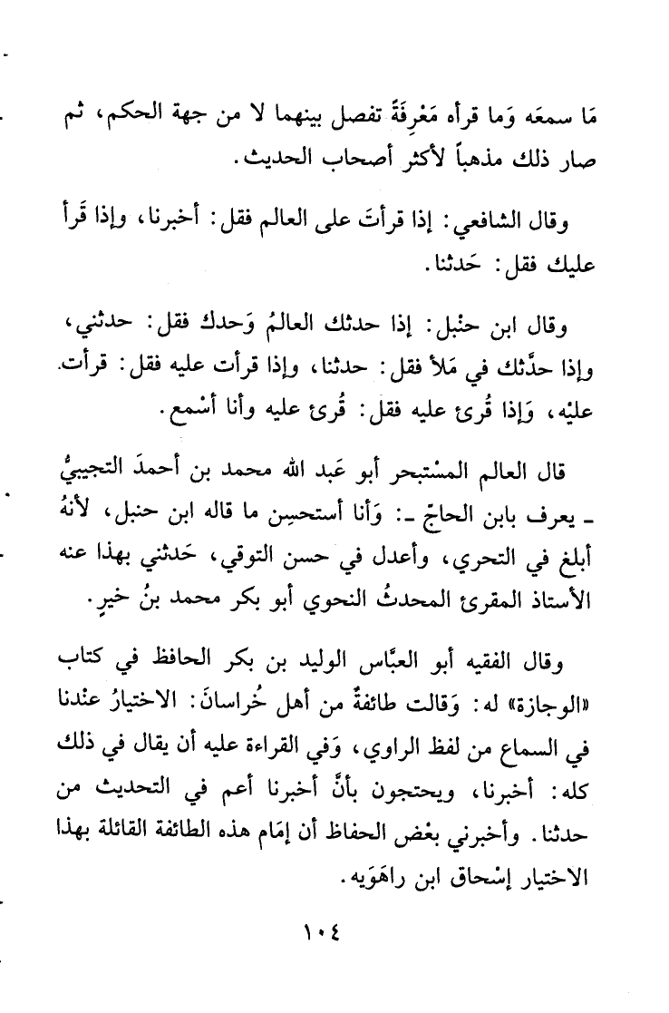 وقال ابن حنْبل: إذا حدثك العالمُ وَحدك فقل: حدثني، وإذا حدّثك في مَلأ فقل: حدثنا، وإذا قرأت عليه فقل: قرأت.