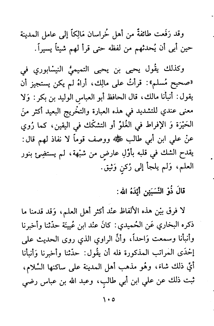 وكذلك يقُول يحى بن يحيى التميمى النيسْابوري في "صحيح مُسلم": قرأتُ على مالِك، أراهُ لم يكن يستجيز أن يقول: أنبانا مالك، قال الحافظ أبو العباسِ الوليد بن بكر: وَلا معنى عندي للتشديد في هذه العبارة والتخْريج البعيد أكثر منَ الحَيْرَة وَالإفراط في الغُلوِّ أو التشكك في اليقين، كما رُوي عنْ علي بن أبي طالب - رضي الله عنه - ووصف قوماً لا نفاذ لهم قال: يقدح الشك في قلبه بأوَّلِ عارضٍ من شبْهة، لم يستضِئ بنور العلم، وَلم يلجأ إلى رُكنٍ وَثيق.