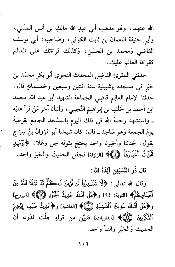 حدثني المقرئ الفاضِل المحدث النحوي أبُو بكرِ محمّد بن خيْرِ في مسجده بإشبيلية سنةَ اثنتين وسبعين وخمسمائةِ قال: حدثنا الإمام العالِم قاضِي الجماعة الشهيد أبو عبد الله محمد ابن أحمدَ بن خَلَفِ بن إبراهيمَ التجيبي، وَأنبانا آخر مَنْ قرأ عليْه - واستشهد رحمهُ الله في ذلك اليوم بالمسْجد الجامع بقرطبةَ يومَ الجمعة وَهو سَاجد- قال: كان شيخنا أبو مَرْوانَ بنُ سِرَاج يقول: حَدثنا وأخبرنا واحد يحتج بقوله جل وعَلا: (يَوْمَئِذٍ تُحَدِّثُ أَخْبَارَهَا) [الزلزلة:4] ، فجعَل الحديثَ والخبرَ واحد.